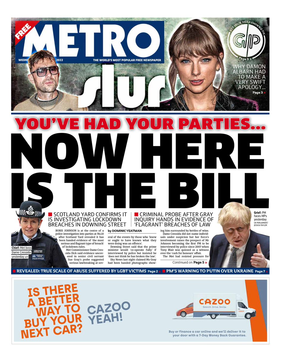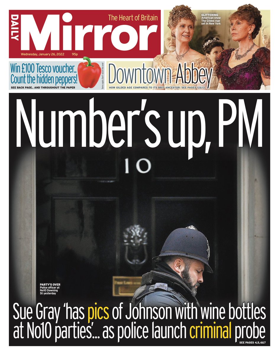 Sue Gray has pics of Johnson with wine bottles at No 10 parties as police launch criminal probe, reads the front page of the Daily Mirror.