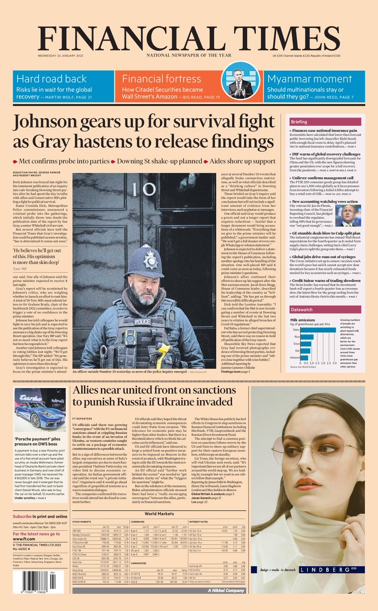 Prime Minister Boris Johnson is geared up for the publication of Sue Gray’s inquiry into rule-breaking Downing Street parties after plotting a fight for political survival with allies and Conservative MPs, reports the Financial Times.