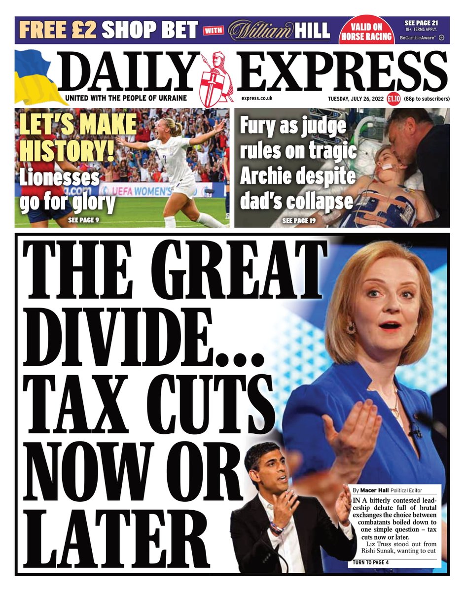 In the Daily Express, the key issue that divided the Tory candidates was whether taxes should be cut now or later.