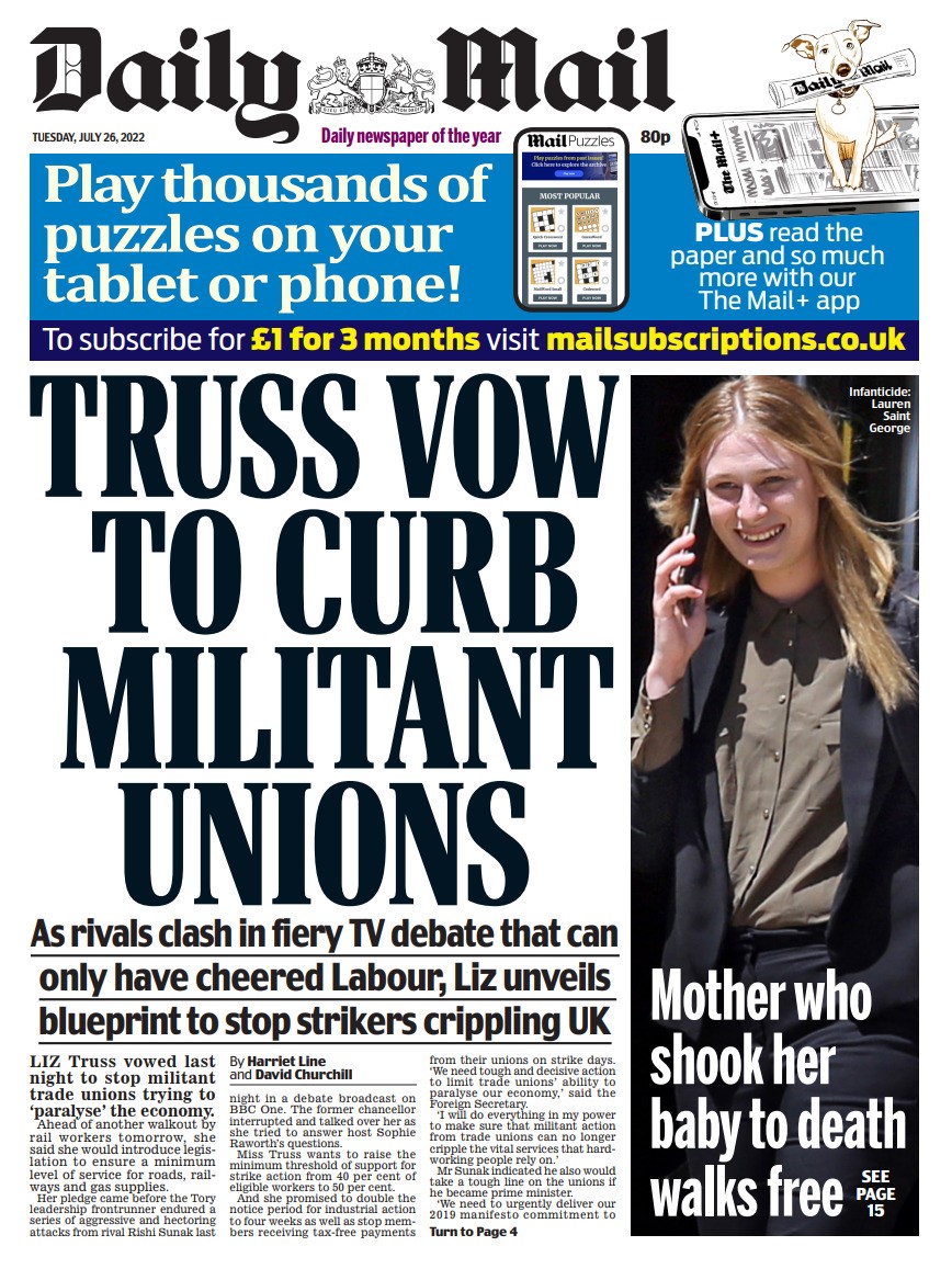 The Daily Mail’s front page features the pledge by Tory leadership frontrunner Liz Truss to reduce union power by ensuring a minimum level of service for roads, railways, and gas utilities.