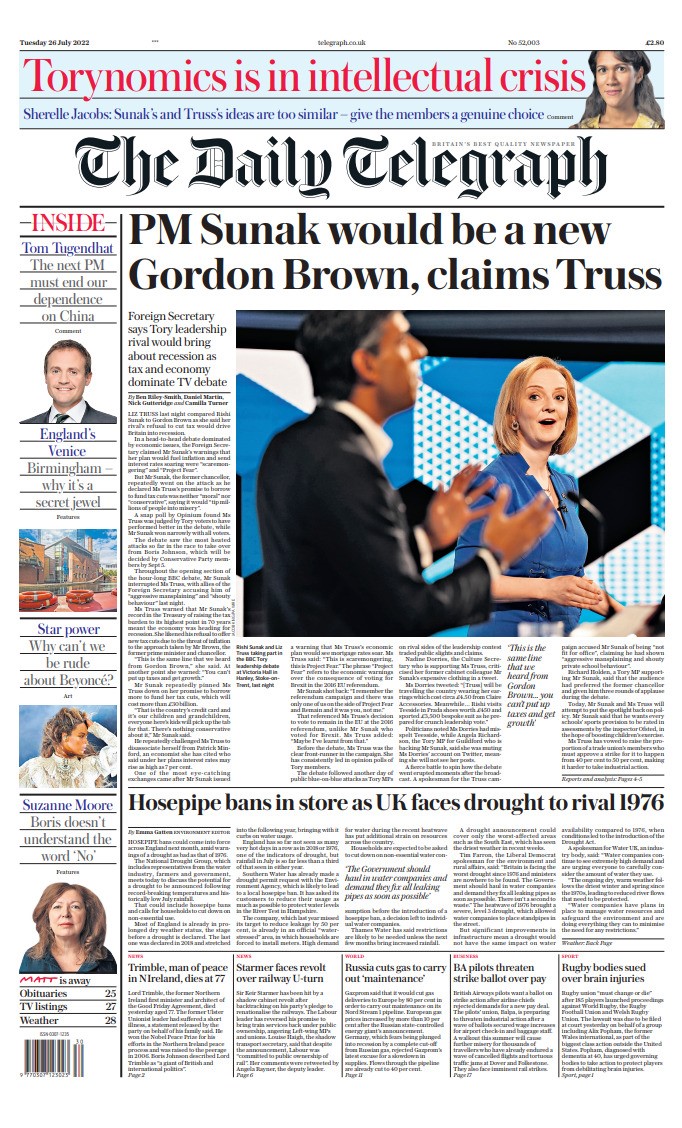 In the Daily Telegraph, Liz Truss compares Rishi Sunak and Gordon Brown, saying Mr Sunak’s refusal to cut taxes would cause a recession.
