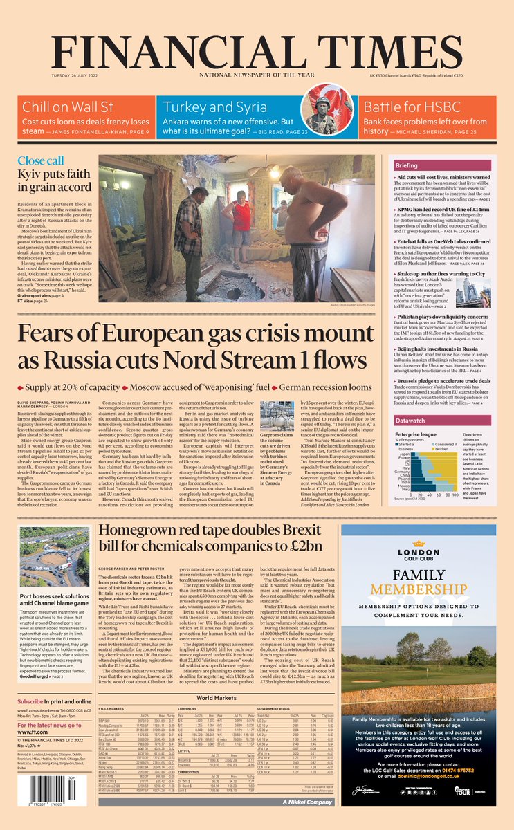 According to Financial Times, Russia is reducing gas supplies through its largest pipeline to Germany this week to a fifth of capacity, which will leave the continent without critical supplies before winter.