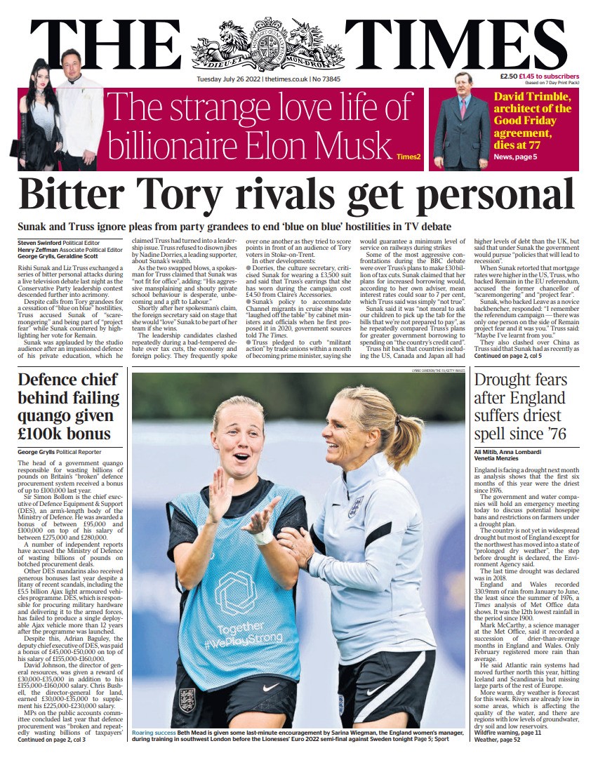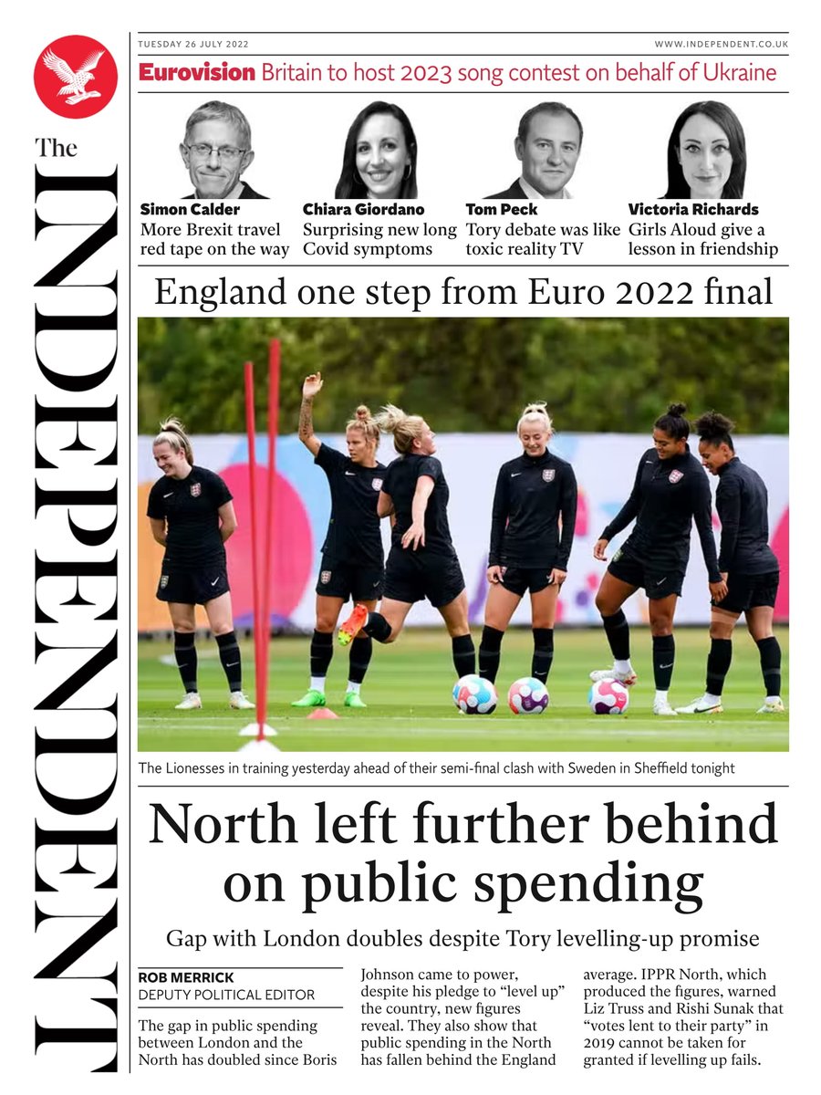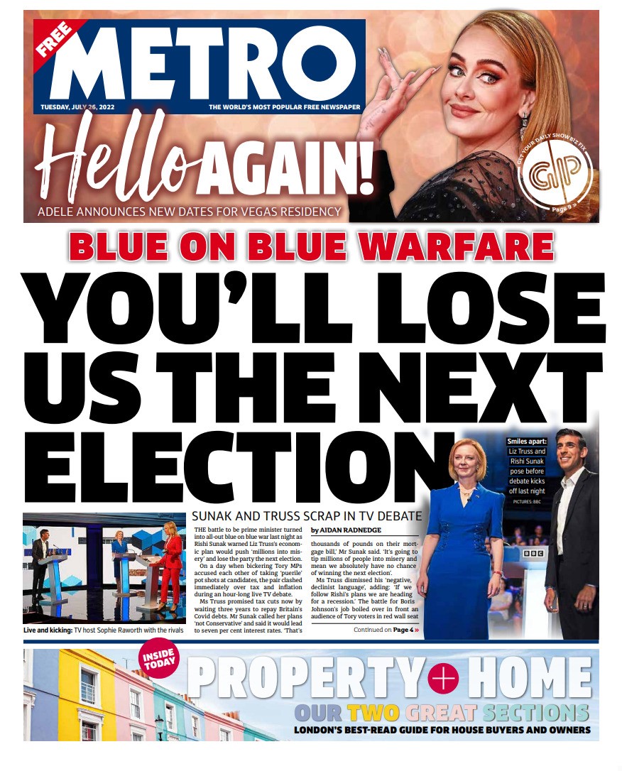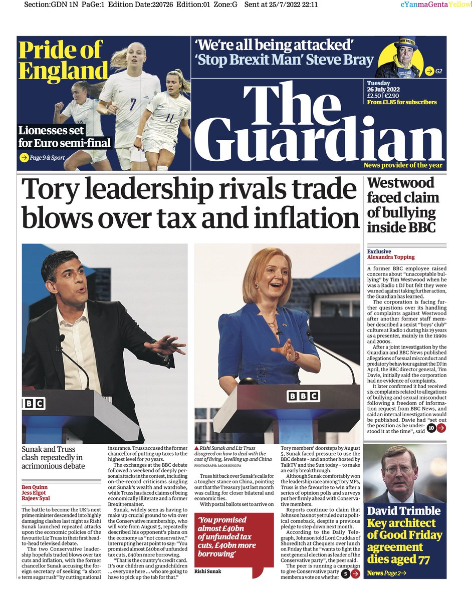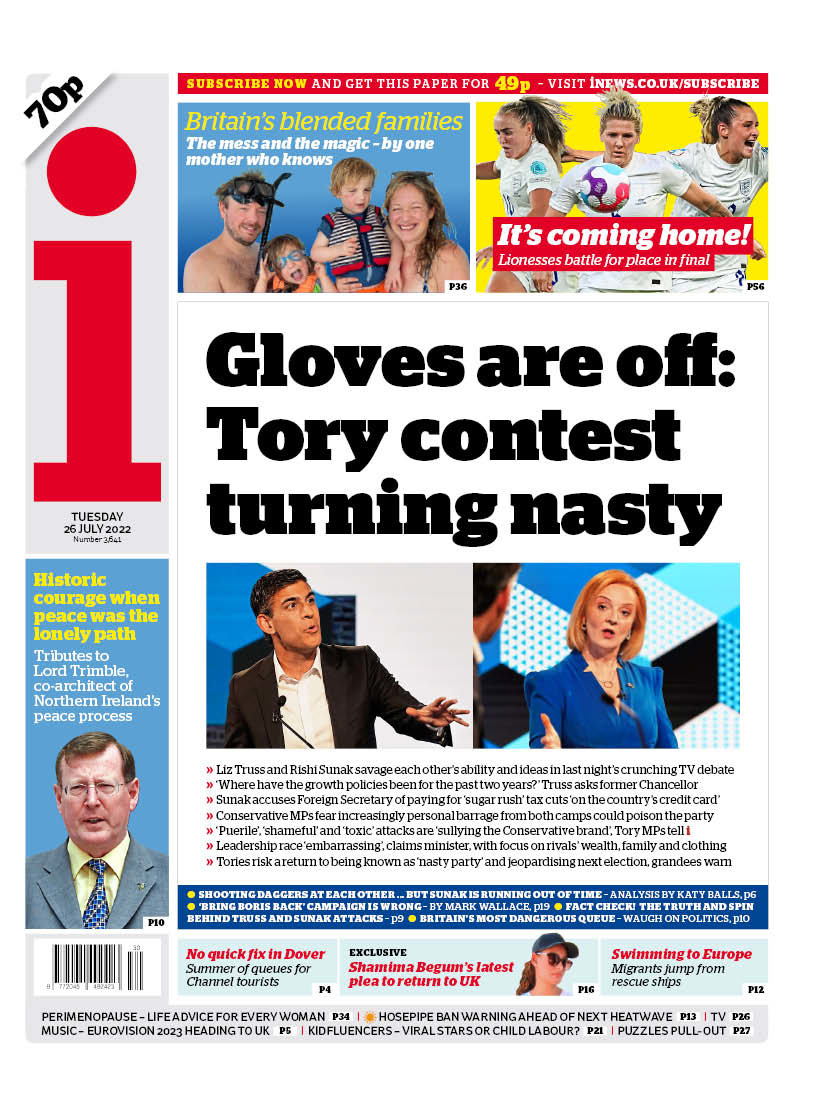 A report in The i highlights Rishi Sunak’s claim that Liz Truss is promising “sugar rush” tax cuts “on the country’s credit card”, while she responds by saying he has failed to grow the economy.