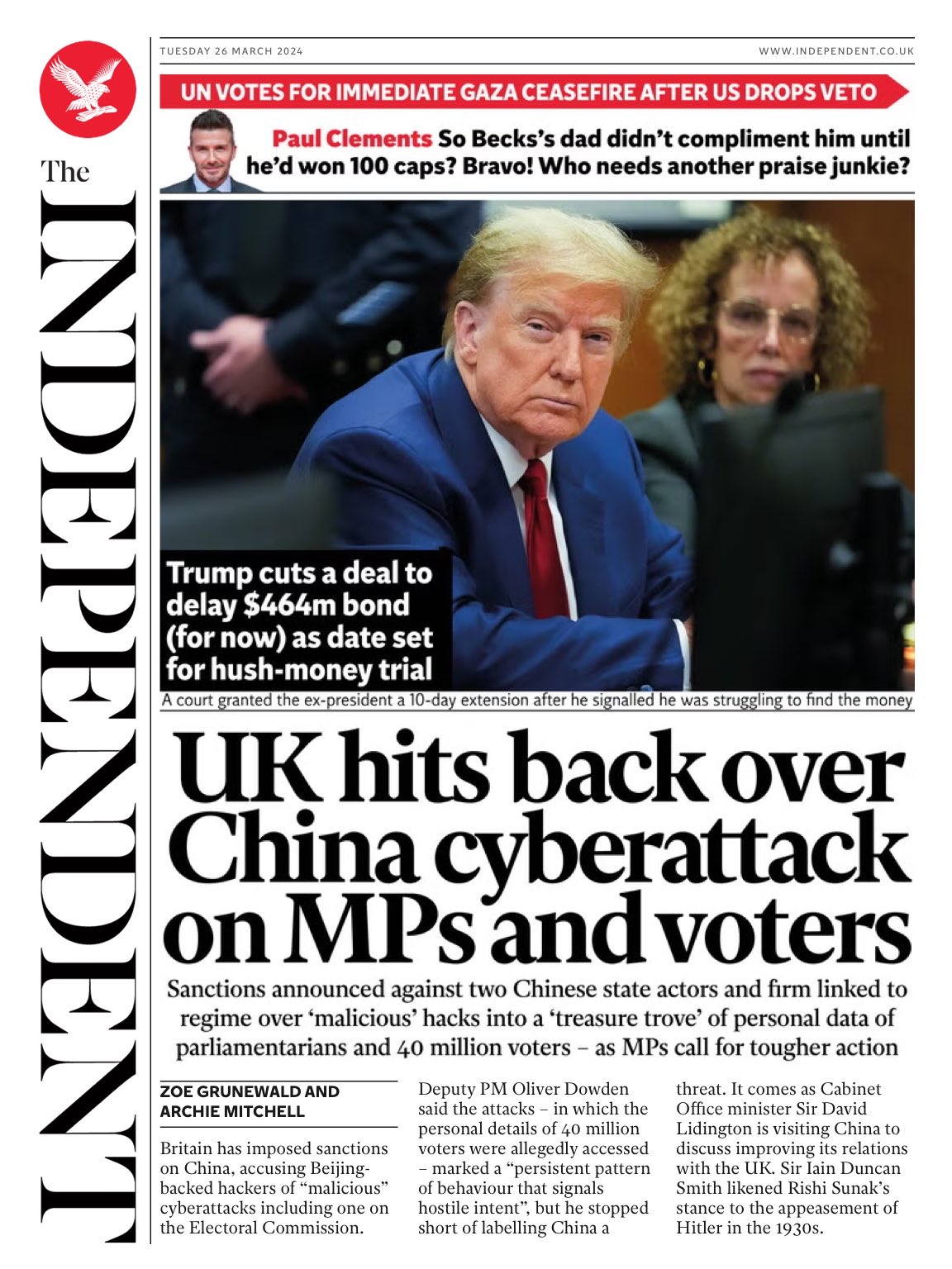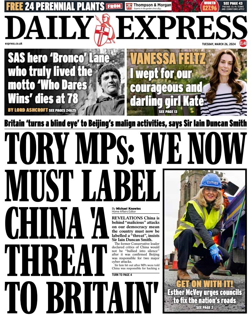 In the Daily Express, ex-Tory leader Iain Duncan Smith calls China a “threat to Britain” following cyber attack reports.