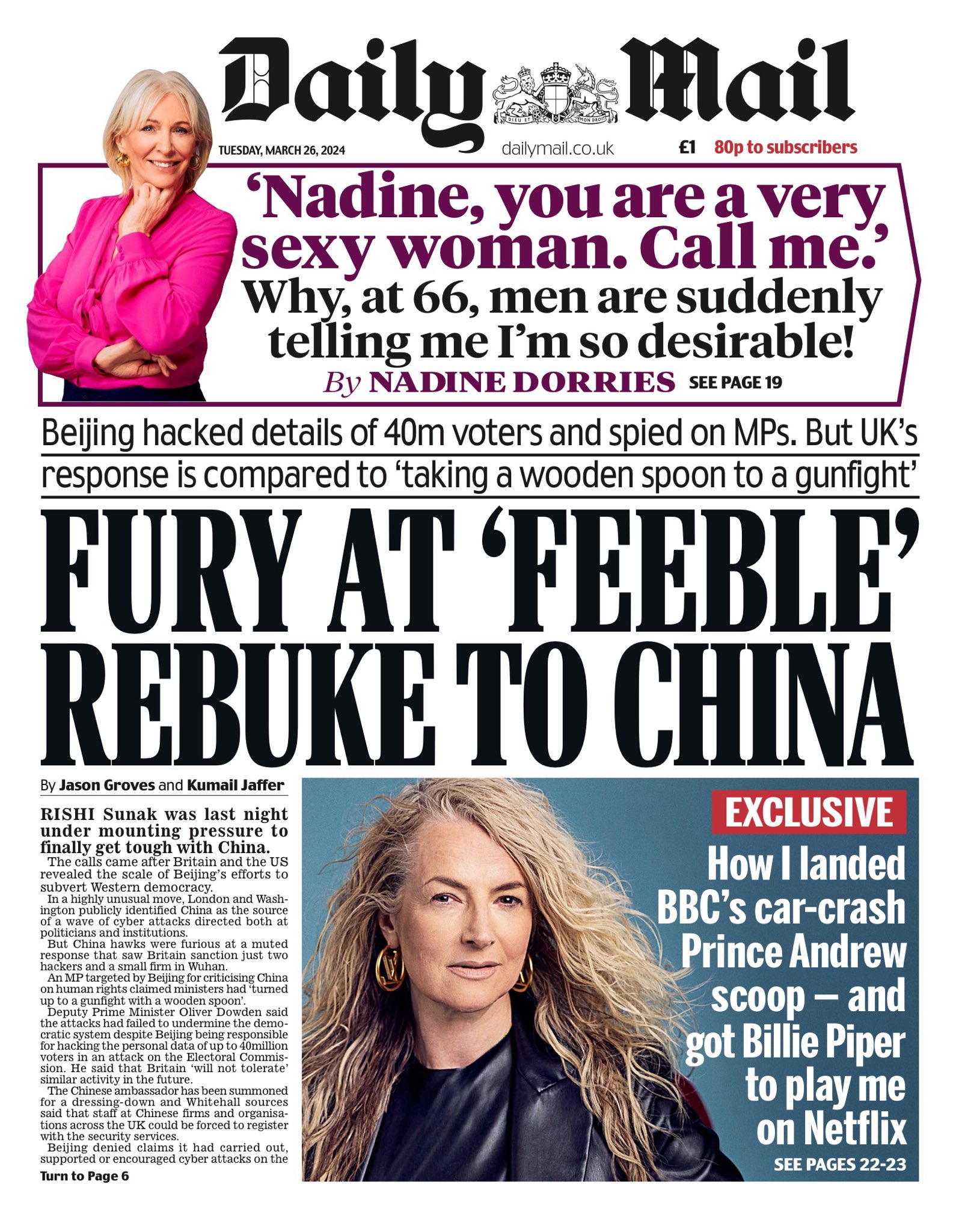 The Daily Mail reports that Rishi Sunak faces mounting pressure from hardline MPs to intensify sanctions on China.