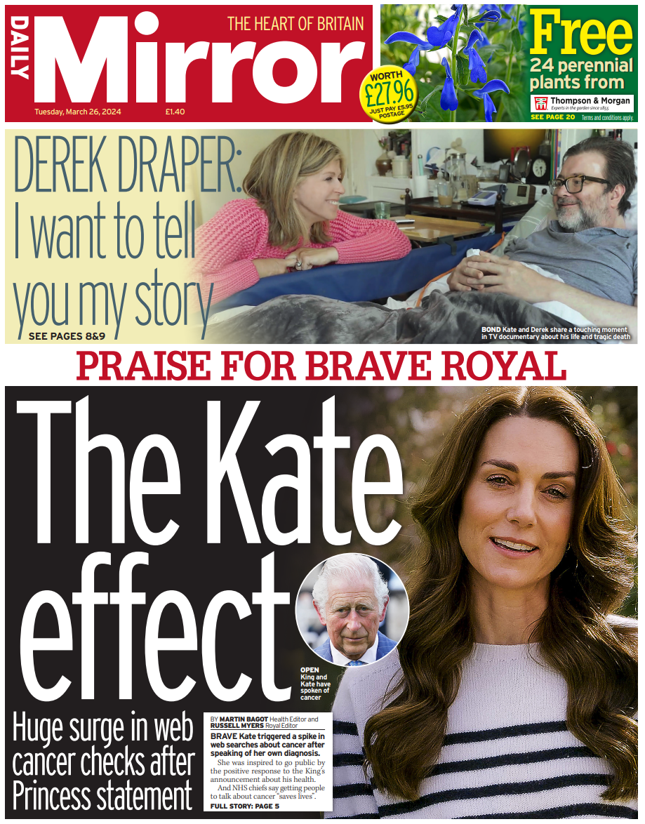 The Daily Mirror reports a surge in online cancer searches following the Princess of Wales’ diagnosis revelation.