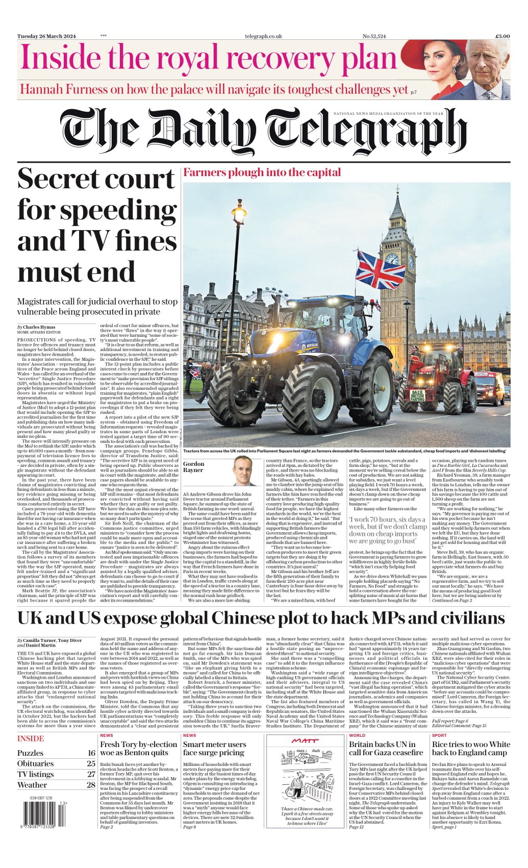 The Magistrates’ Association’s call to halt secret court hearings for certain offences is the main story in the Daily Telegraph, aiming to safeguard vulnerable individuals.