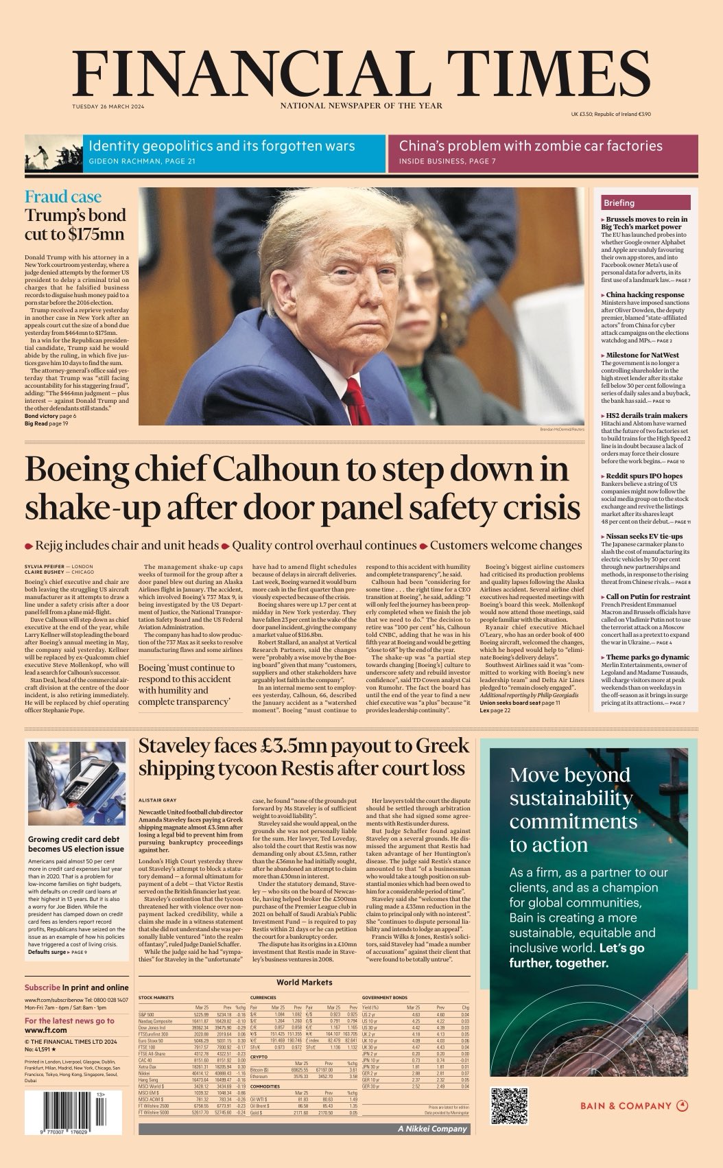 The Financial Times reports Boeing’s top executives stepping down following a mid-flight plane door panel incident.