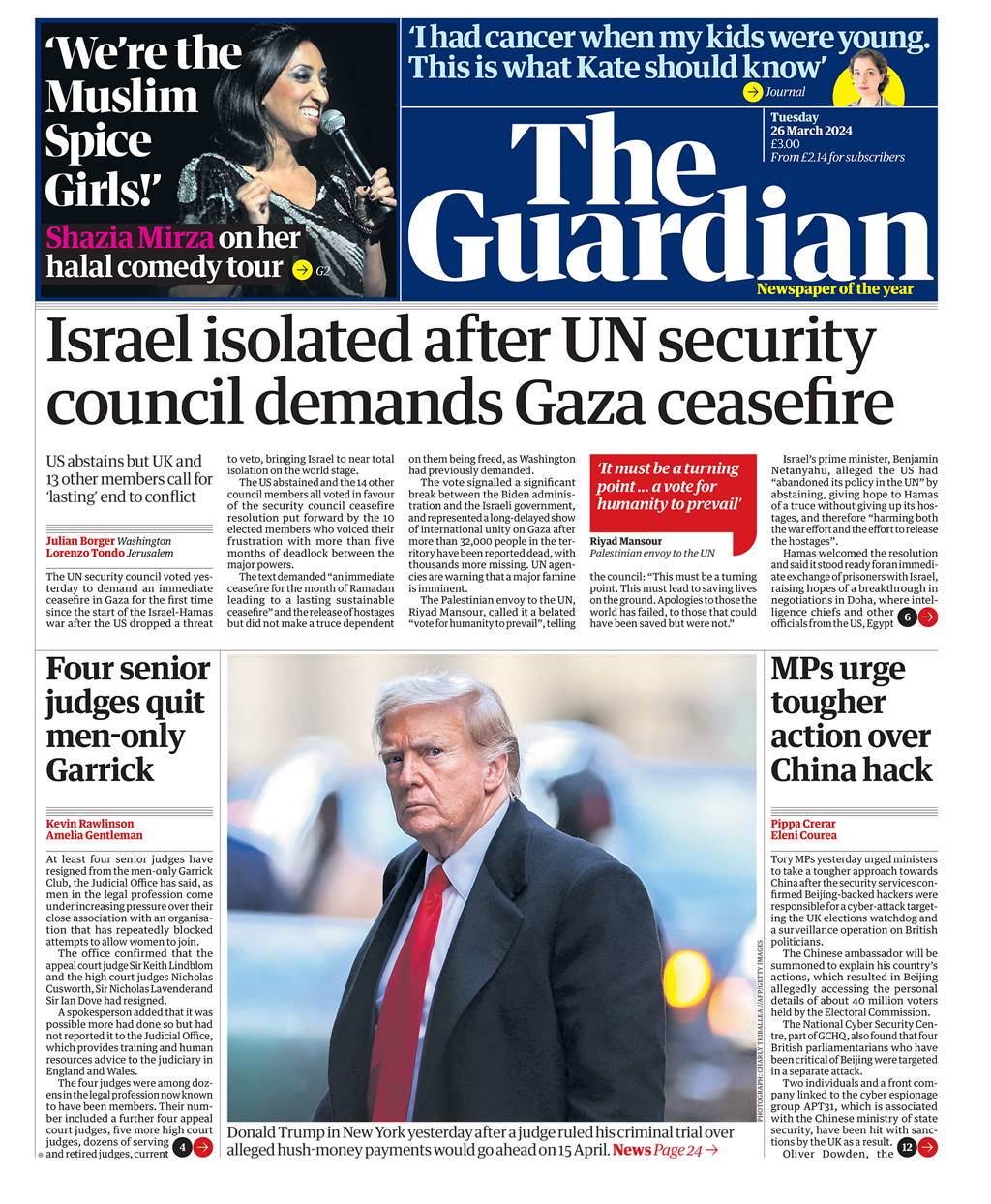 The Guardian highlights Israel’s isolation following the UN security council’s vote for an immediate Gaza ceasefire.