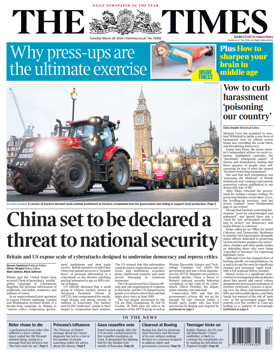 The Times reveals that China is facing allegations from the UK and US for initiating a series of global cyber attacks.