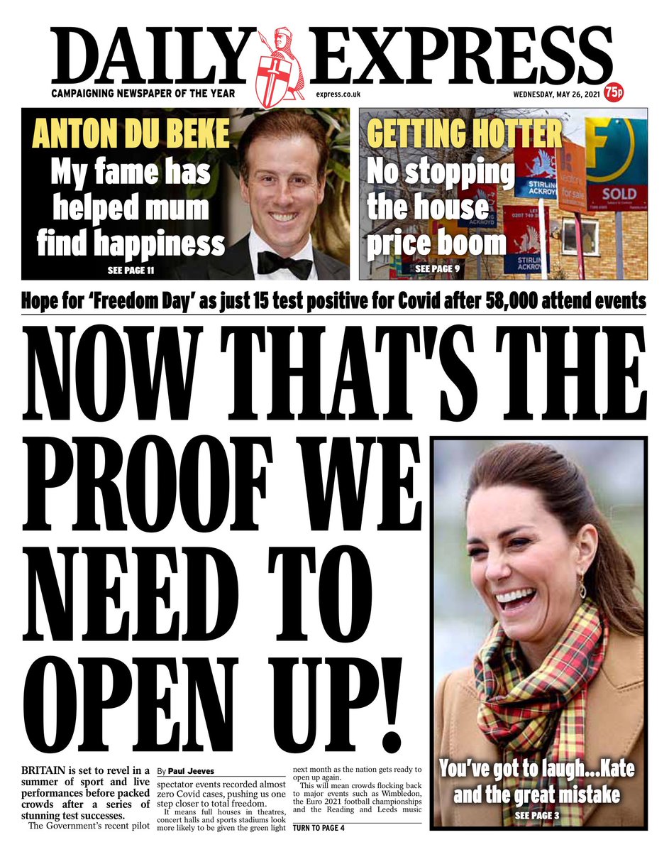 The Daily Express says Britain is set to revel in a summer of sport and live performances before packed crowds after a series of stunning test successes.