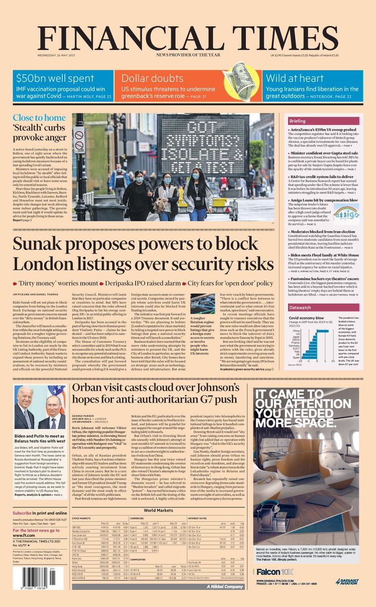 Chancellor Rishi Sunak will set out plans to block companies from listing on the London Stock Exchange on national security grounds as government concerns mount over the “dirty money” in British financial markets, the Financial Times reports.