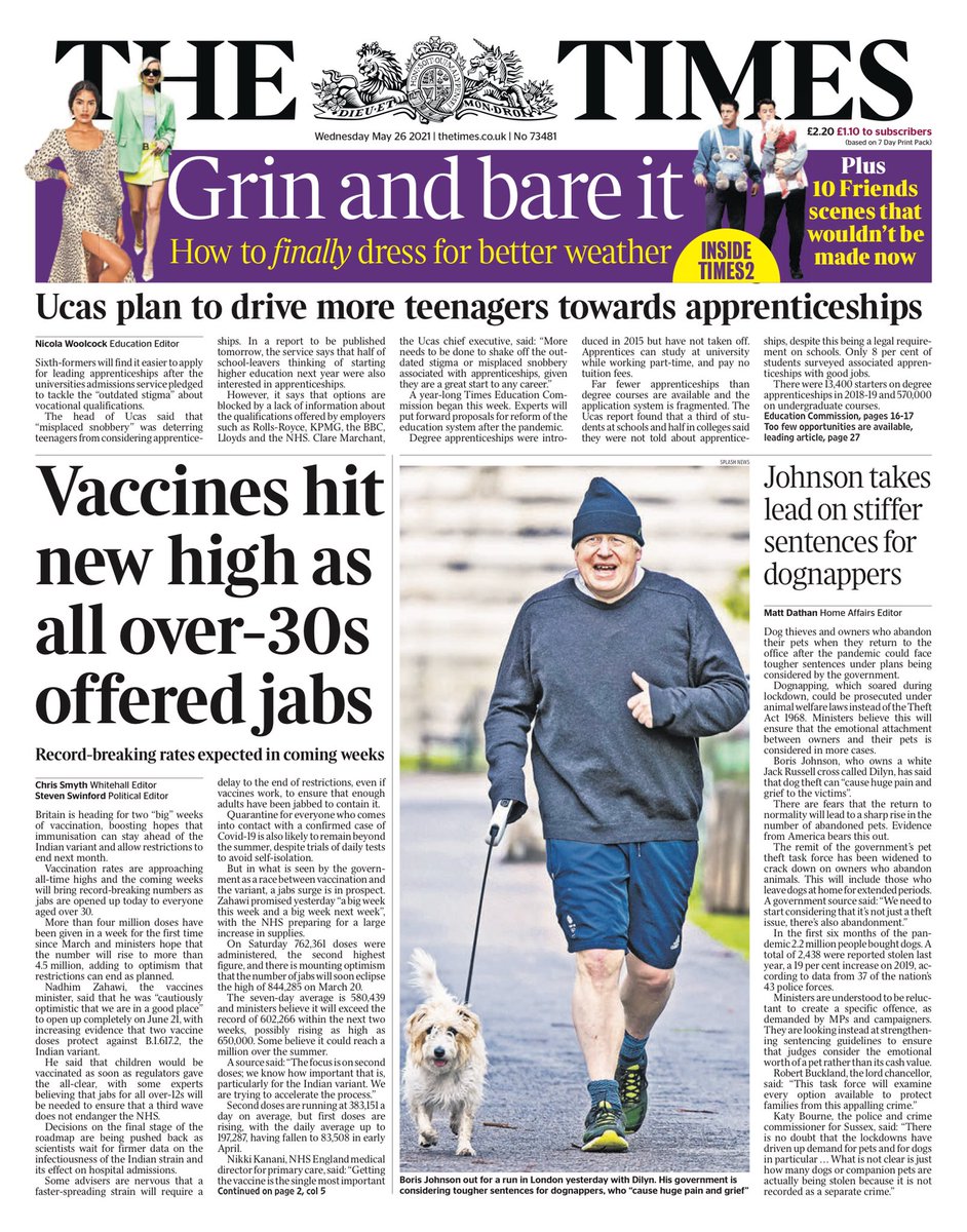 Britain is heading for two “big” weeks of vaccination, boosting hopes that immunisation can stay ahead of the Indian variant and allow restrictions to end next month, The Times writes.