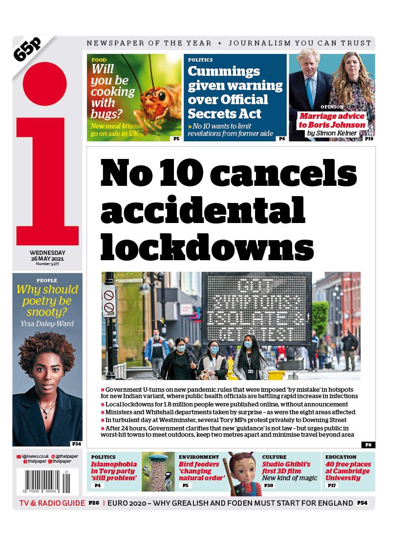 The i leads with the same story saying Number 10 cancelled “accidental lockdowns”.