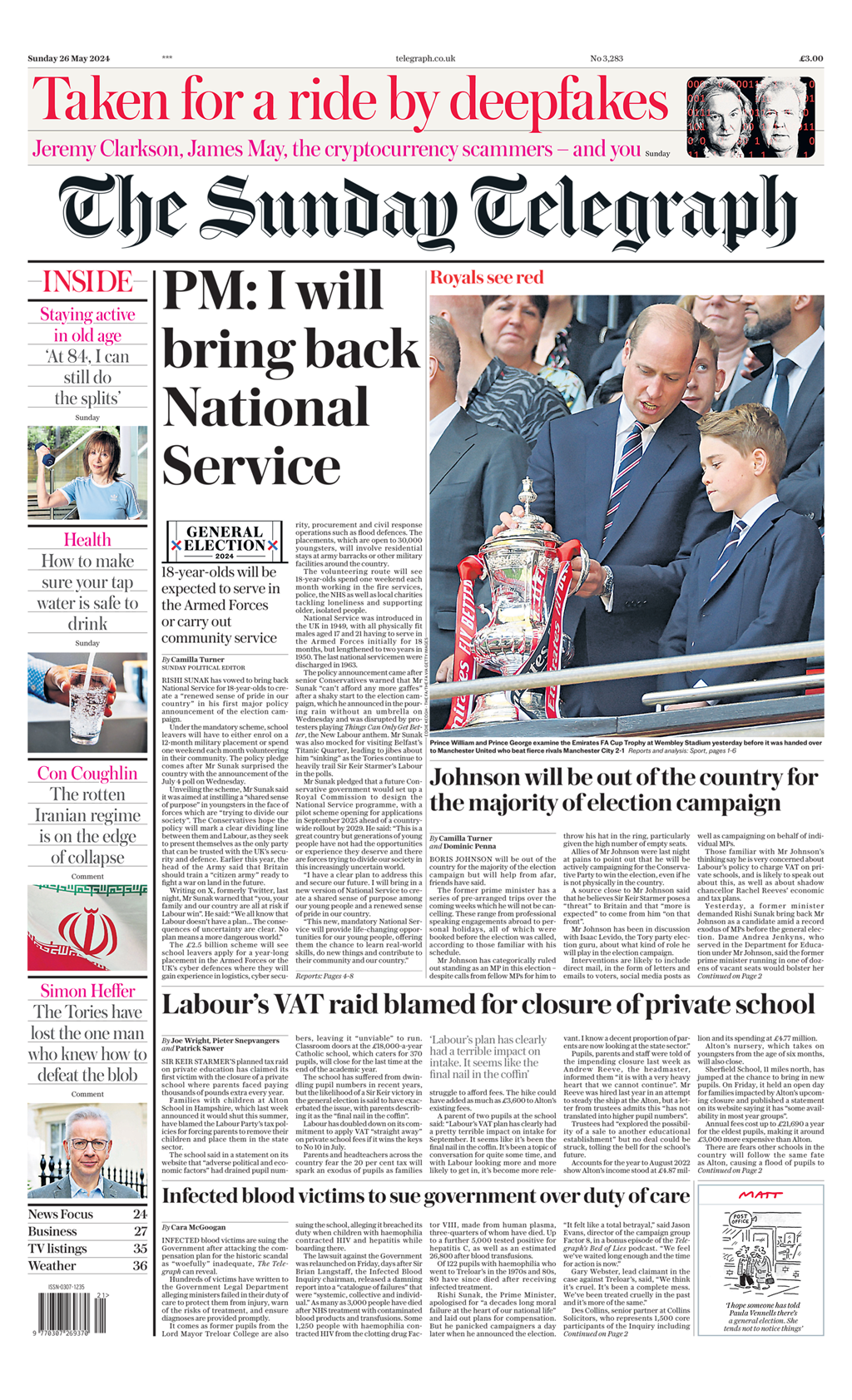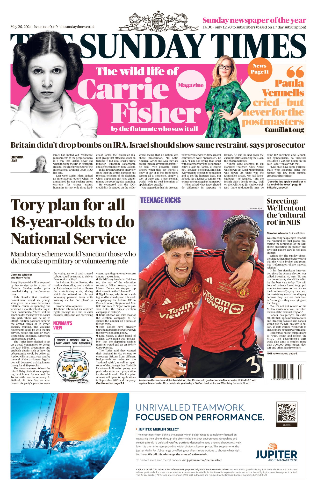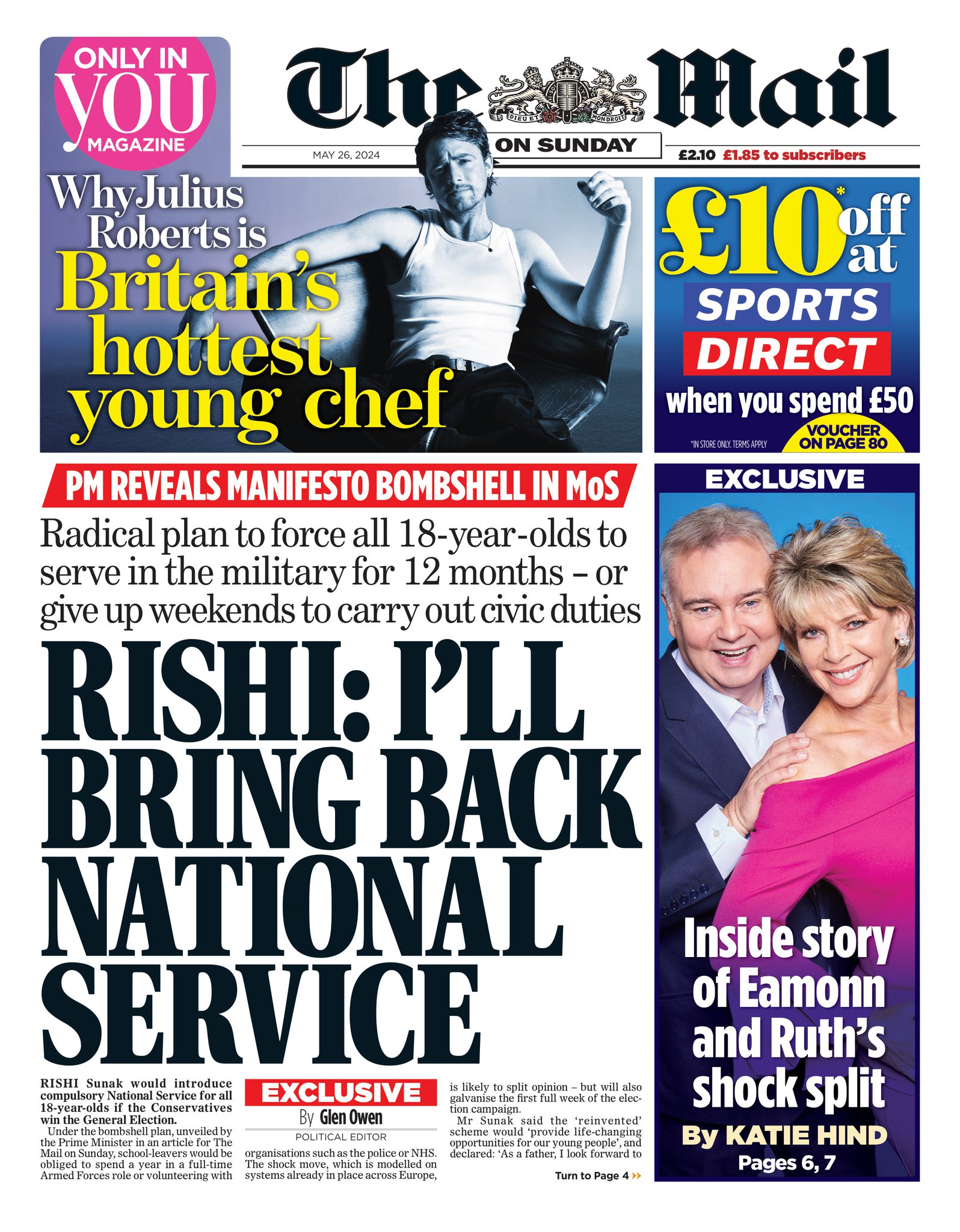 The Sunday Times reports on Rishi Sunak’s proposal to mandate National Service for 18-year-olds if the Tories win the July election.