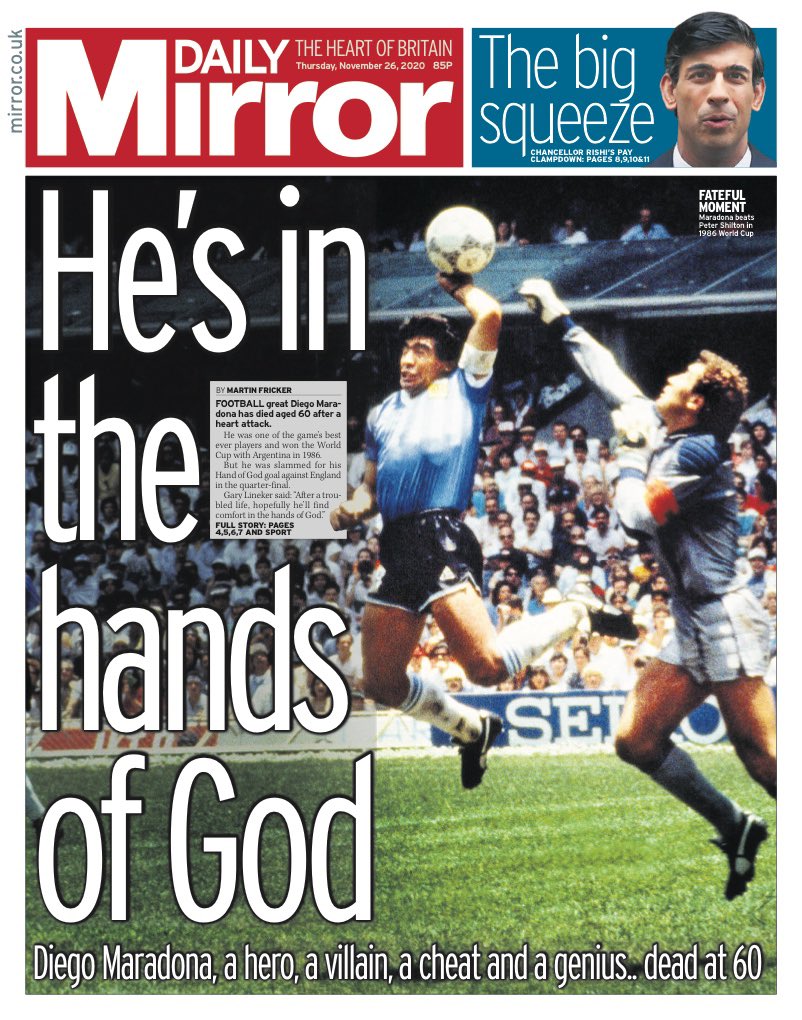 The Daily Mirror describes Diego Maradona as “a hero, a villain, a cheat and a genius” following his death.