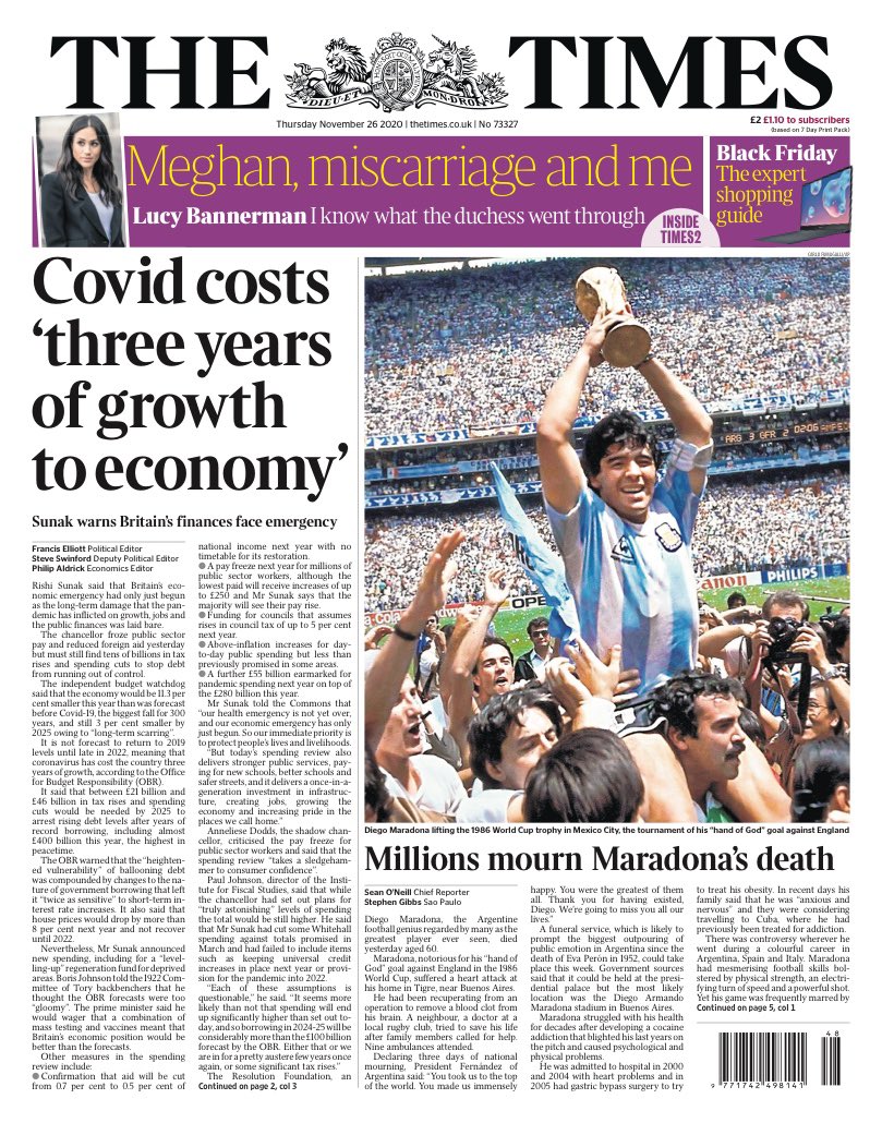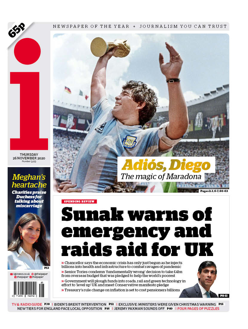 Metro leads with tributes for footballer Diego Maradona, who has died from a heart attack at the age of 60.