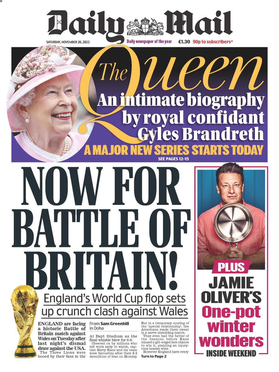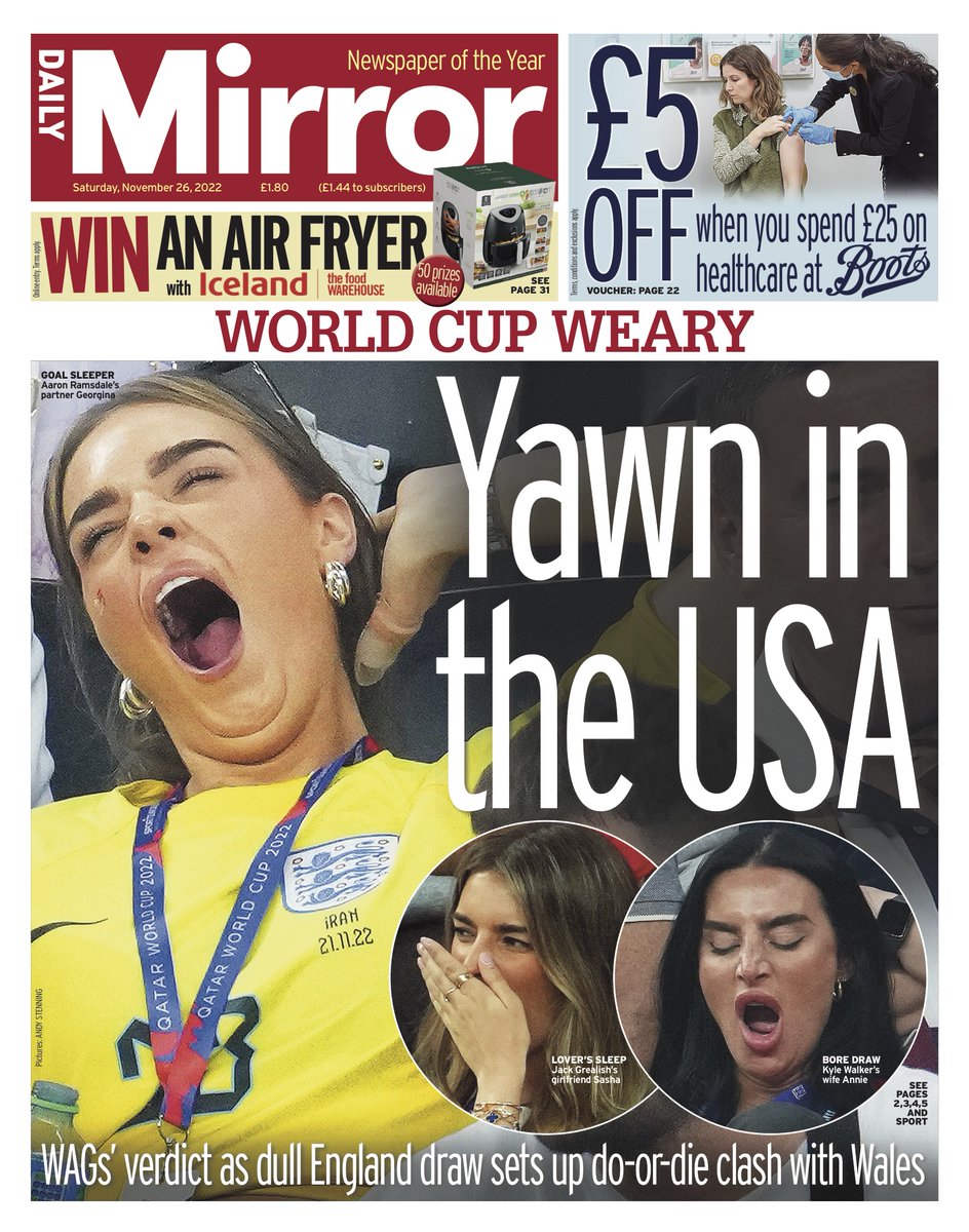 The Daily Mirror reports that England’s fans and players’ partners were underwhelmed by their side’s goalless draw with the USA in their second World Cup match.