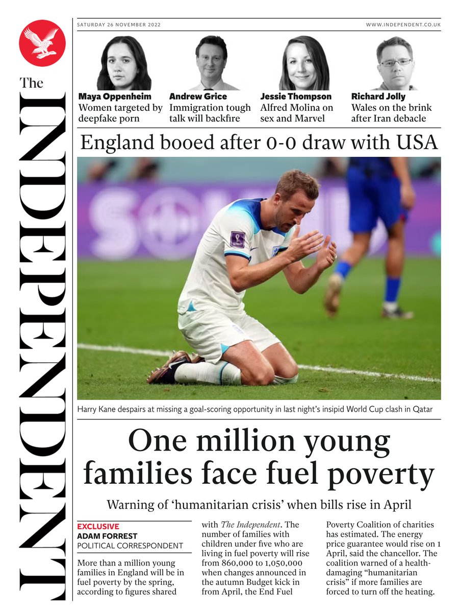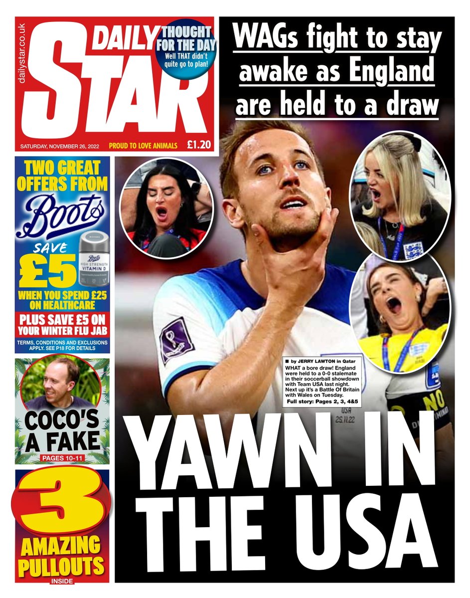 “The Daily Star repeats the Daily Mirror’s assessment of England’s second World Cup match with another headline, “Yawn in the USA.”.