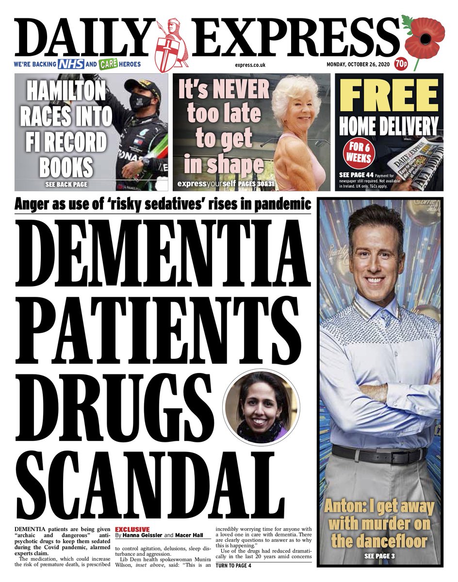 The Daily Express leads with claims that dementia patients are being given “archaic and dangerous” anti-psychotic drugs to keep them sedated during the pandemic.