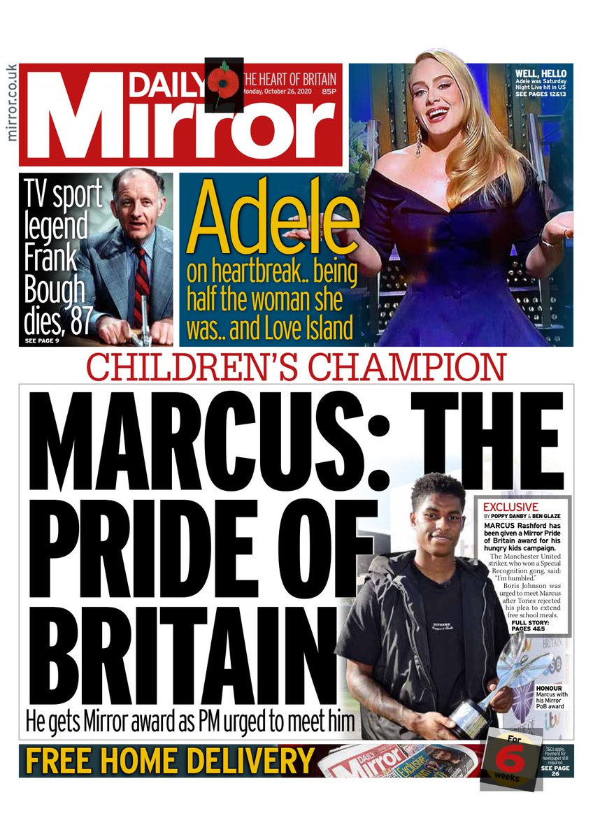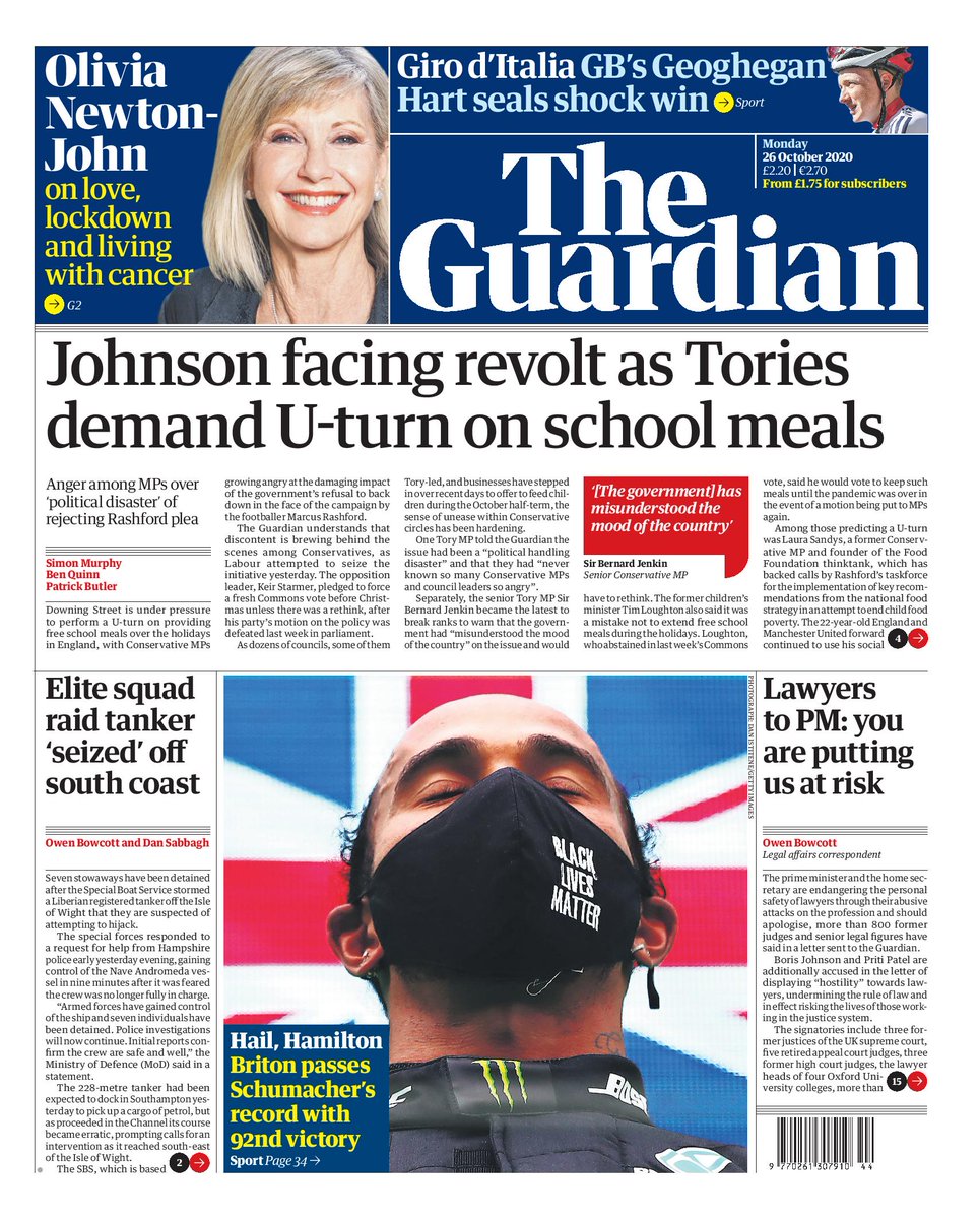 The Guardian says the government is under increasing pressure to change its position on providing free school meals over the holidays in England – as the campaign by footballer Marcus Rashford gathers more momentum.