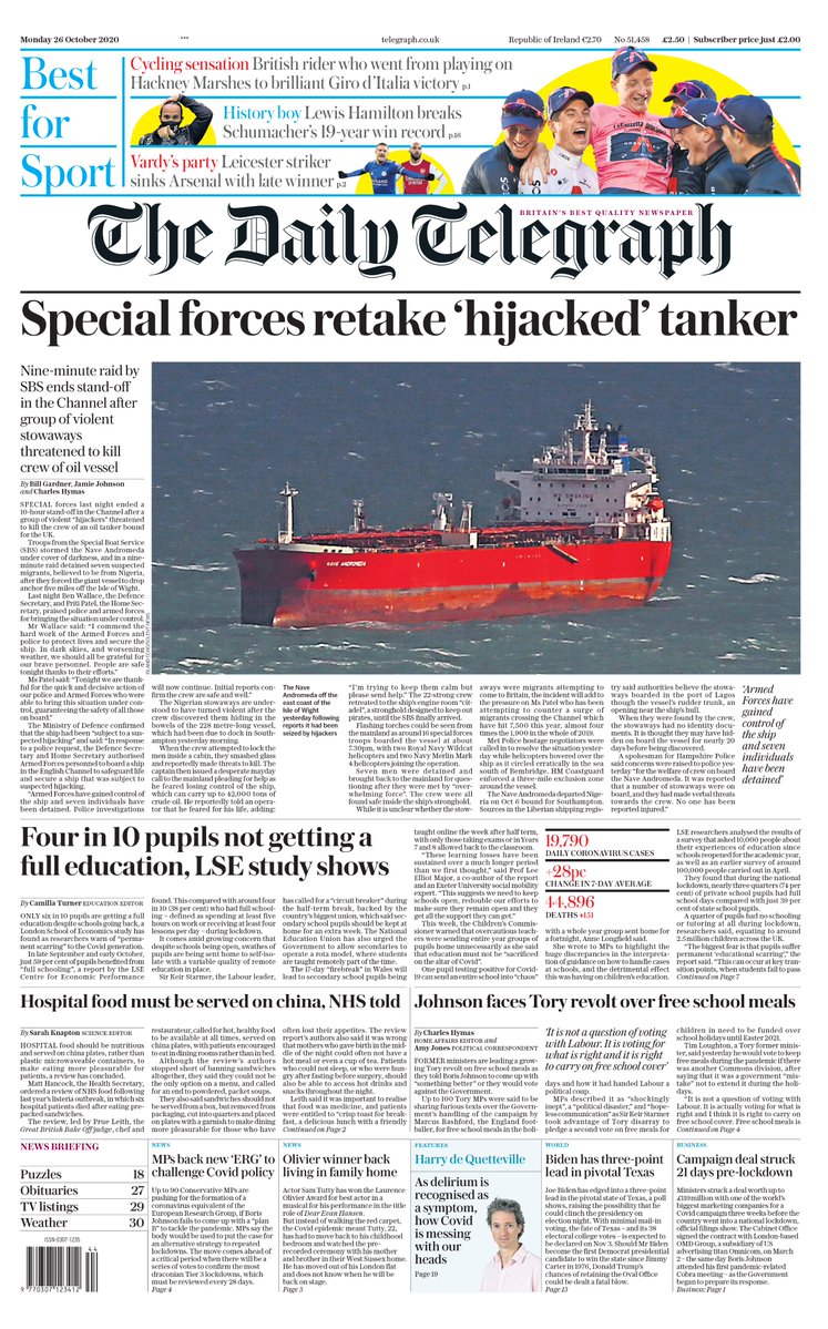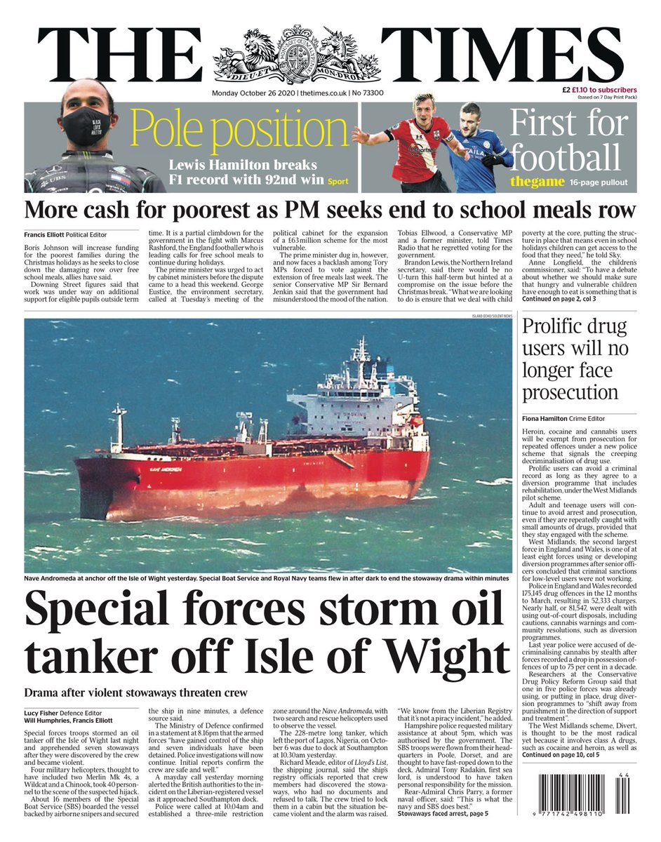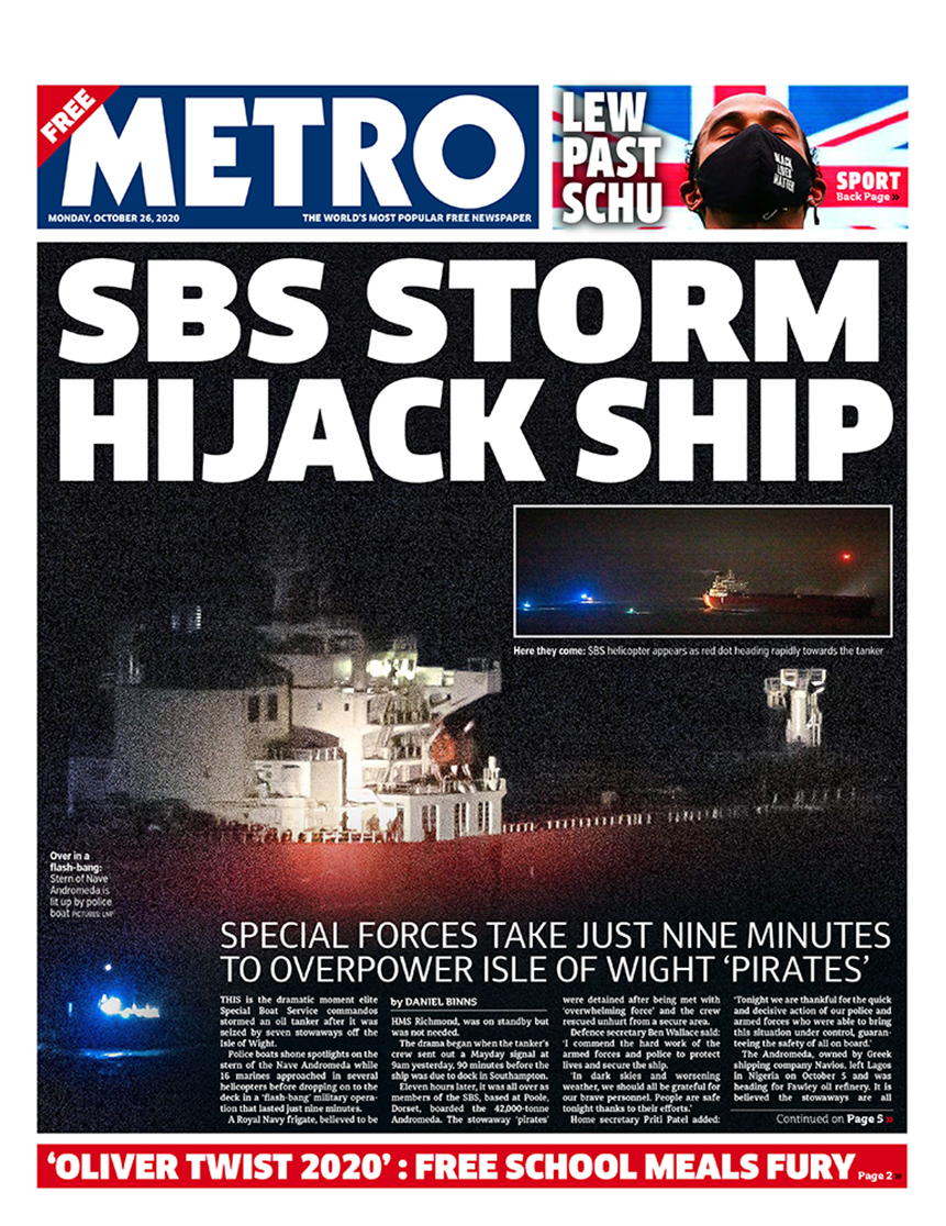 The Times says a stand-off on a tanker in the Channel began after the crew discovered seven stowaways, who then became violent.Airborne snipers were on hand to back up the SBS, who raided the vessel on Sunday evening and saved the crew in less than 10 minutes.
