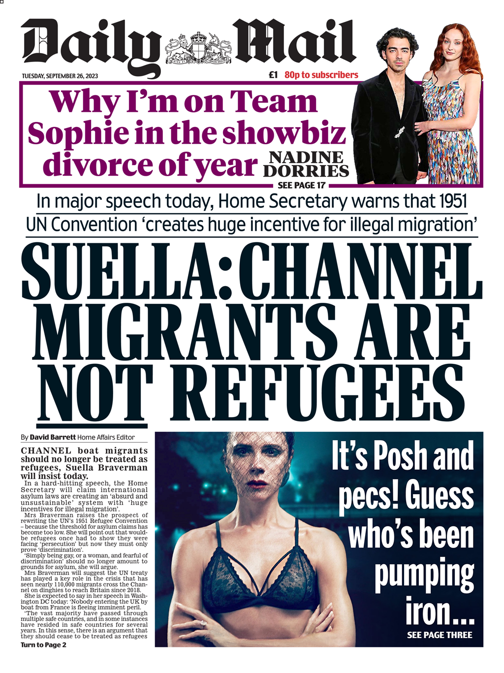 The Daily Express reveals Home Secretary Suella Braverman’s view that Channel migrants should not be seen as refugees and calls the current asylum system unsustainable.