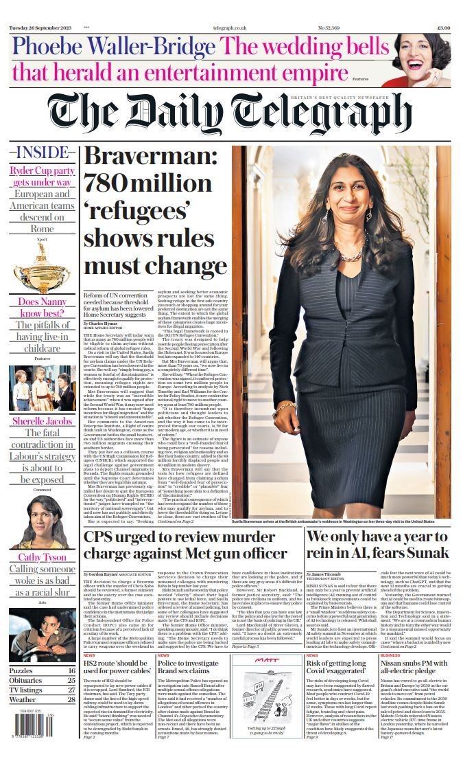 The Daily Telegraph reveals the home secretary’s warning about potential 780 million asylum claims without global refugee rule reform.