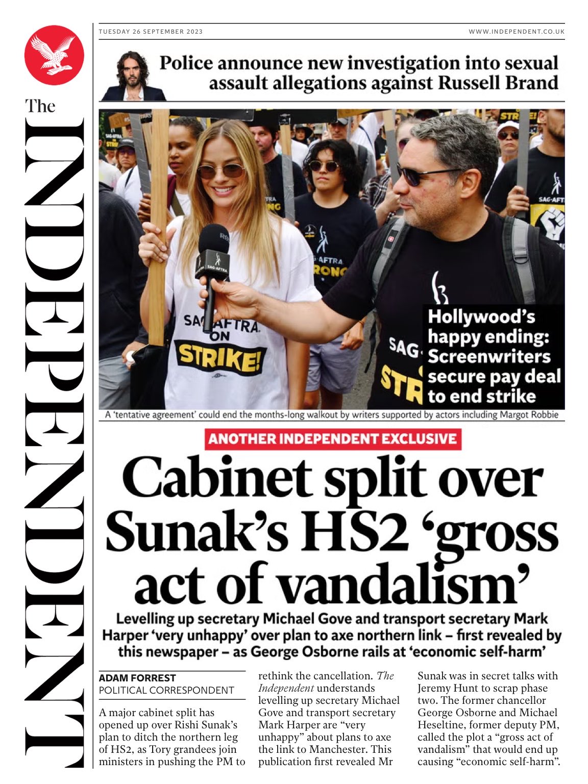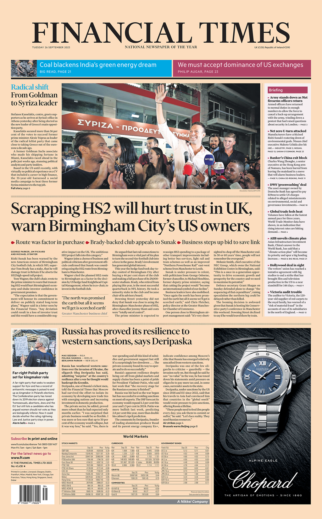 The Financial Times reveals that Birmingham City football club’s US owners have cautioned Rishi Sunak against abandoning the HS2 high-speed rail project.