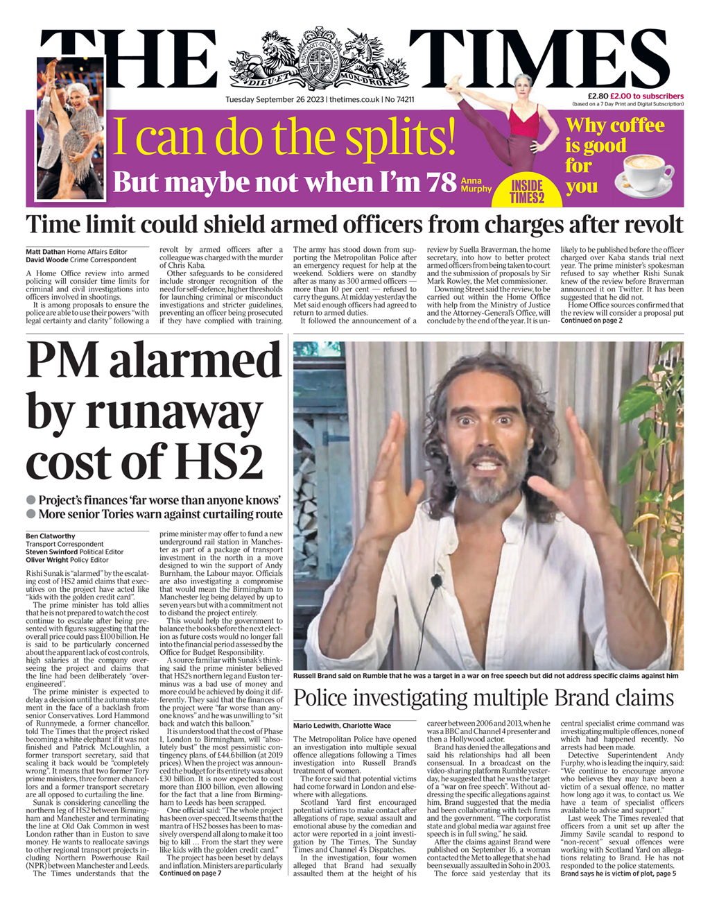 The Times highlights Rishi Sunak’s concerns over the extravagant spending on the HS2 project.