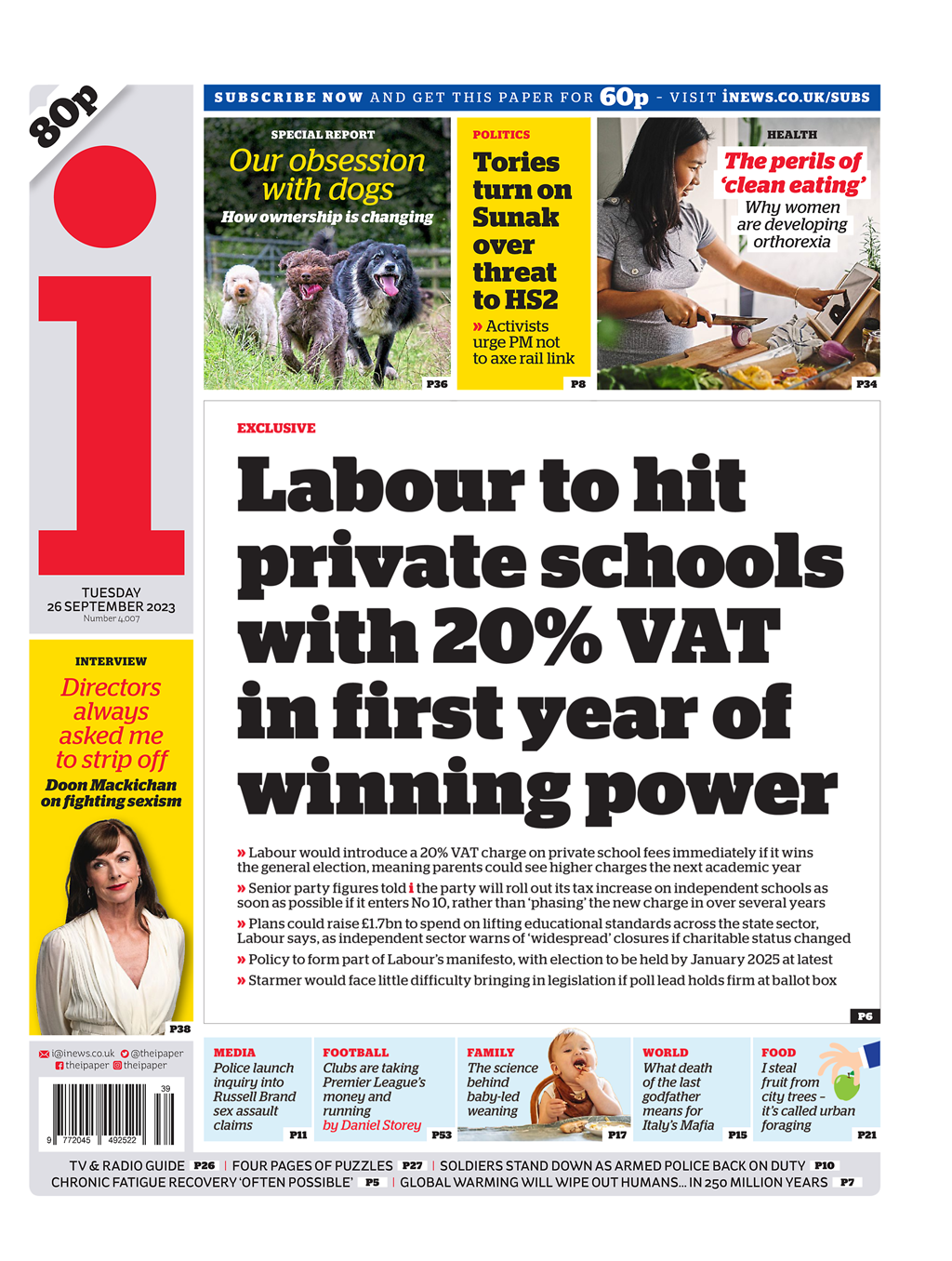 The i newspaper reports that Labour plans to impose a 20% VAT on private school fees if they win the upcoming general election.