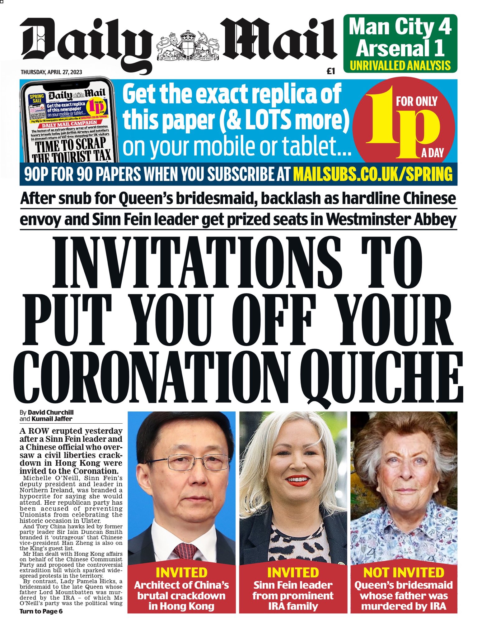 The Daily Mail covers backlash over coronation invitations sent to Chinese VP Han Zheng and Sinn Fein’s Michelle O’Neill.