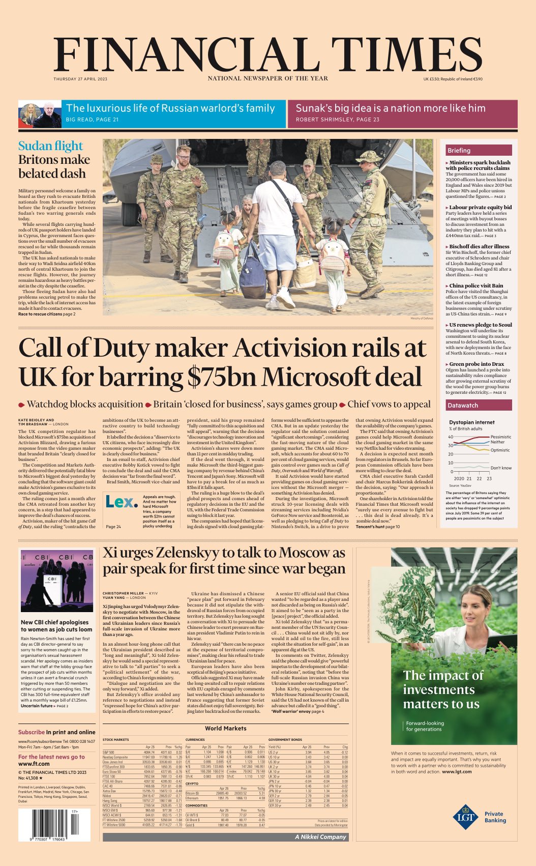 The Financial Times discusses Activision’s response to UK competition regulator blocking Microsoft’s $75bn acquisition of the company.