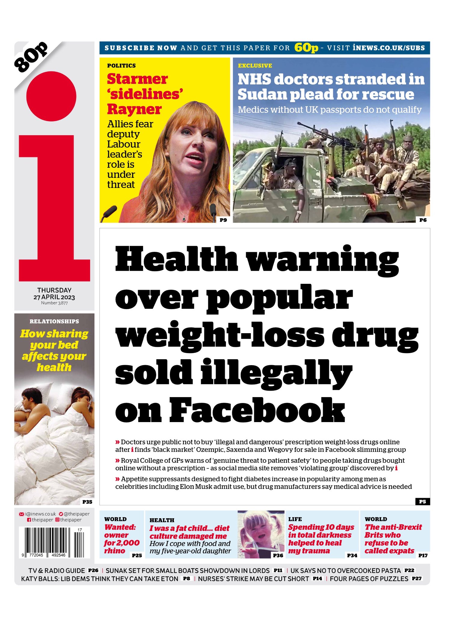 The i paper reports on doctors warning against illegally sold weight loss drugs Ozempic and Wegovy on Facebook.