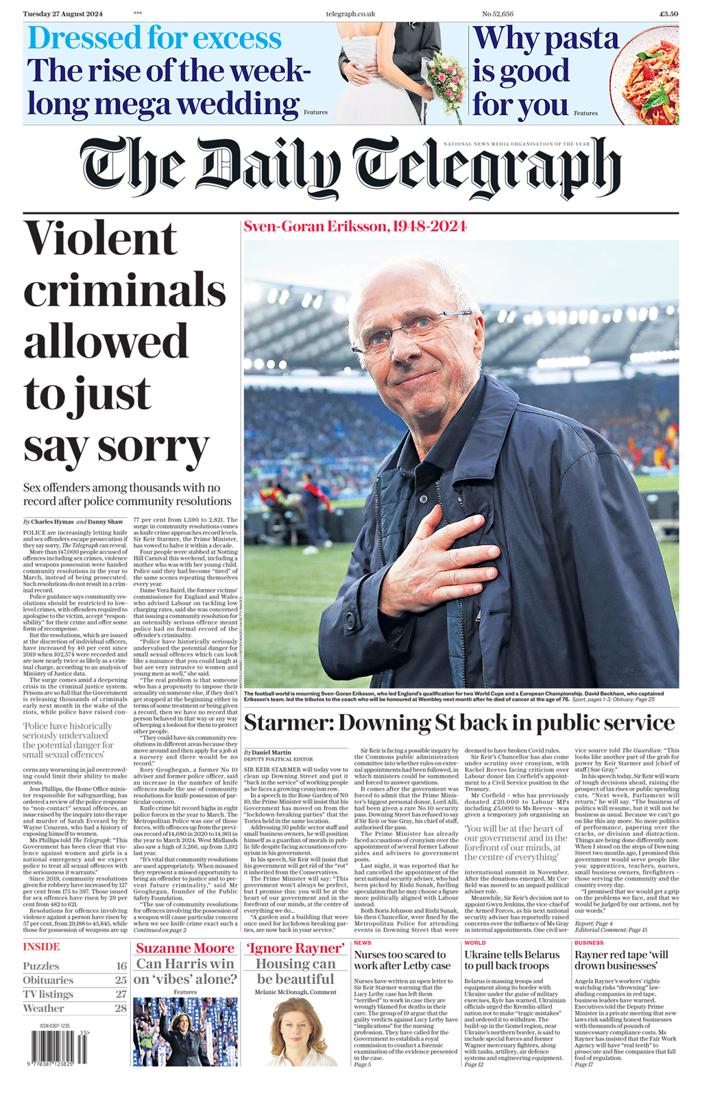 The Daily Telegraph reports that police are allowing knife and sex offenders to avoid prosecution if they apologise.