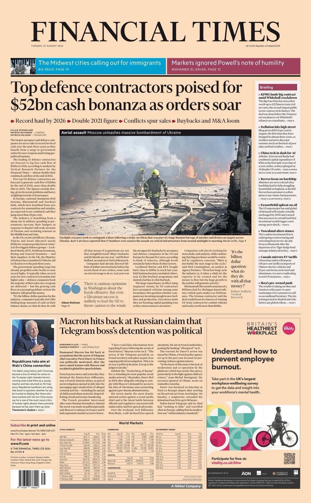 The largest aerospace and defence companies are set to rake in a record haul of $52bn over the next three years as they benefit from a surge in government and political tensions, with conflicts spurring sales, buybacks, and mergers and acquisitions.