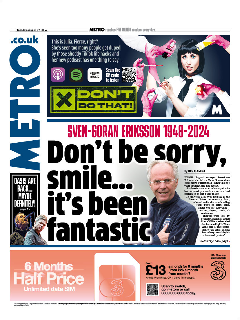 Sven-Göran Eriksson, the renowned Swedish football manager, has passed away at the age of 76, with his final words before his death being, “Don’t be sorry, smile… it’s been fantastic”.