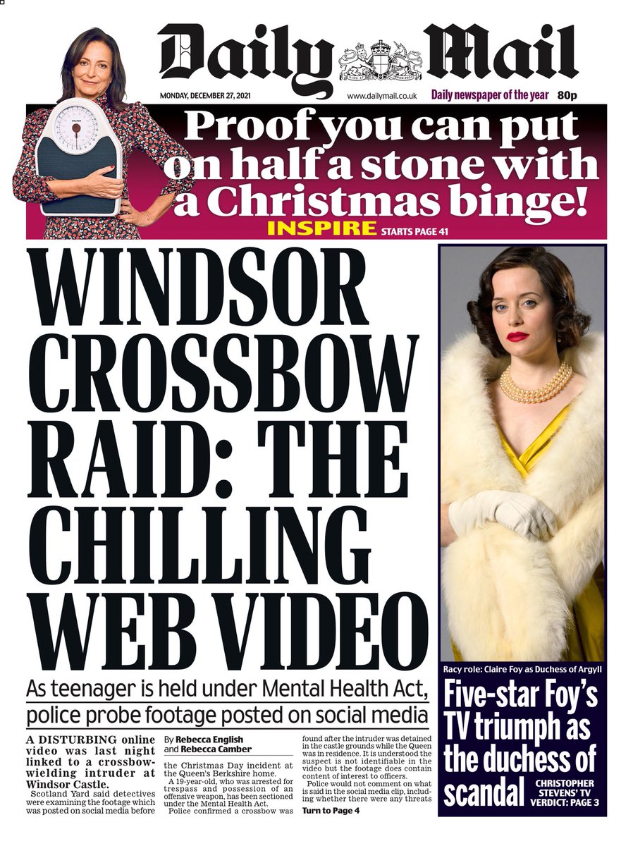 The Daily Mail leads with the news that an online video has been linked to a crossbow-wielding intruder at Windsor Castle.