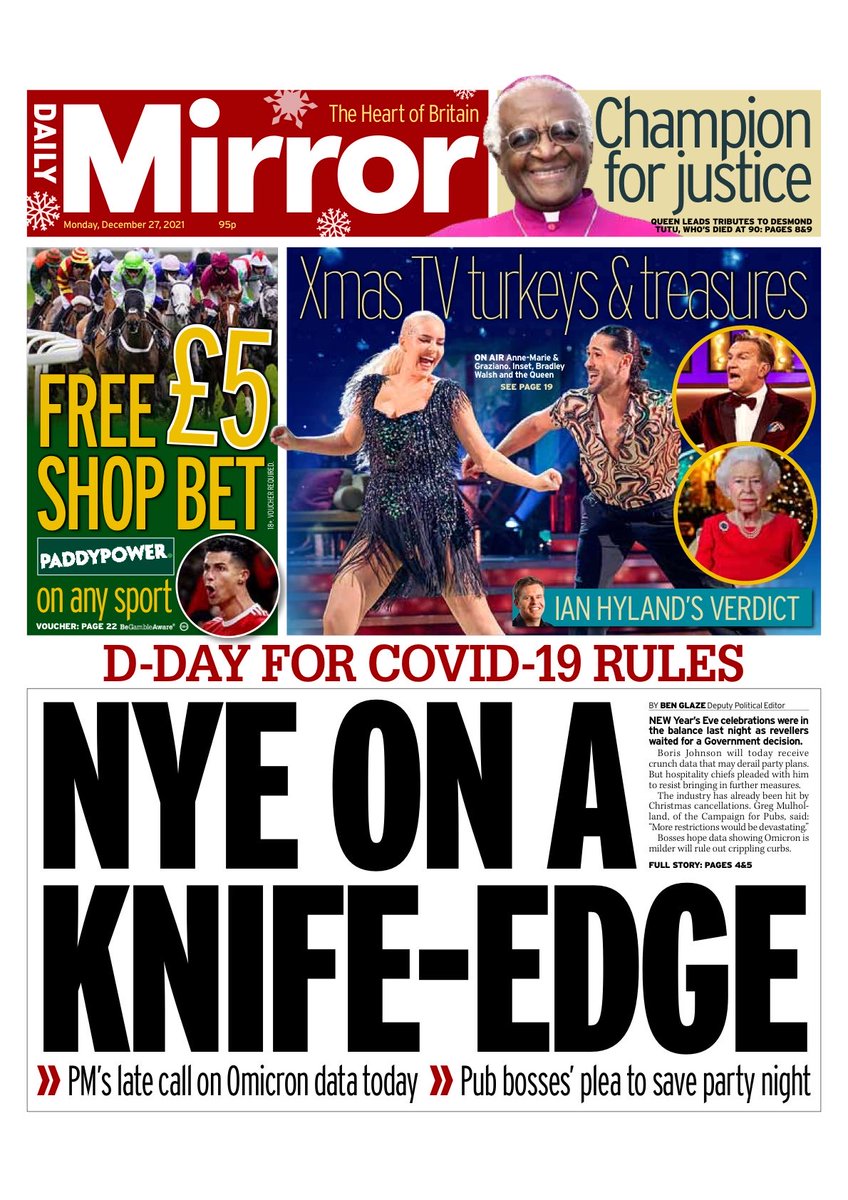 The Daily Mirror also reports that Boris Johnson will receive fresh COVID data on Monday, with hospitality chiefs calling for him to resist bringing in further measures.