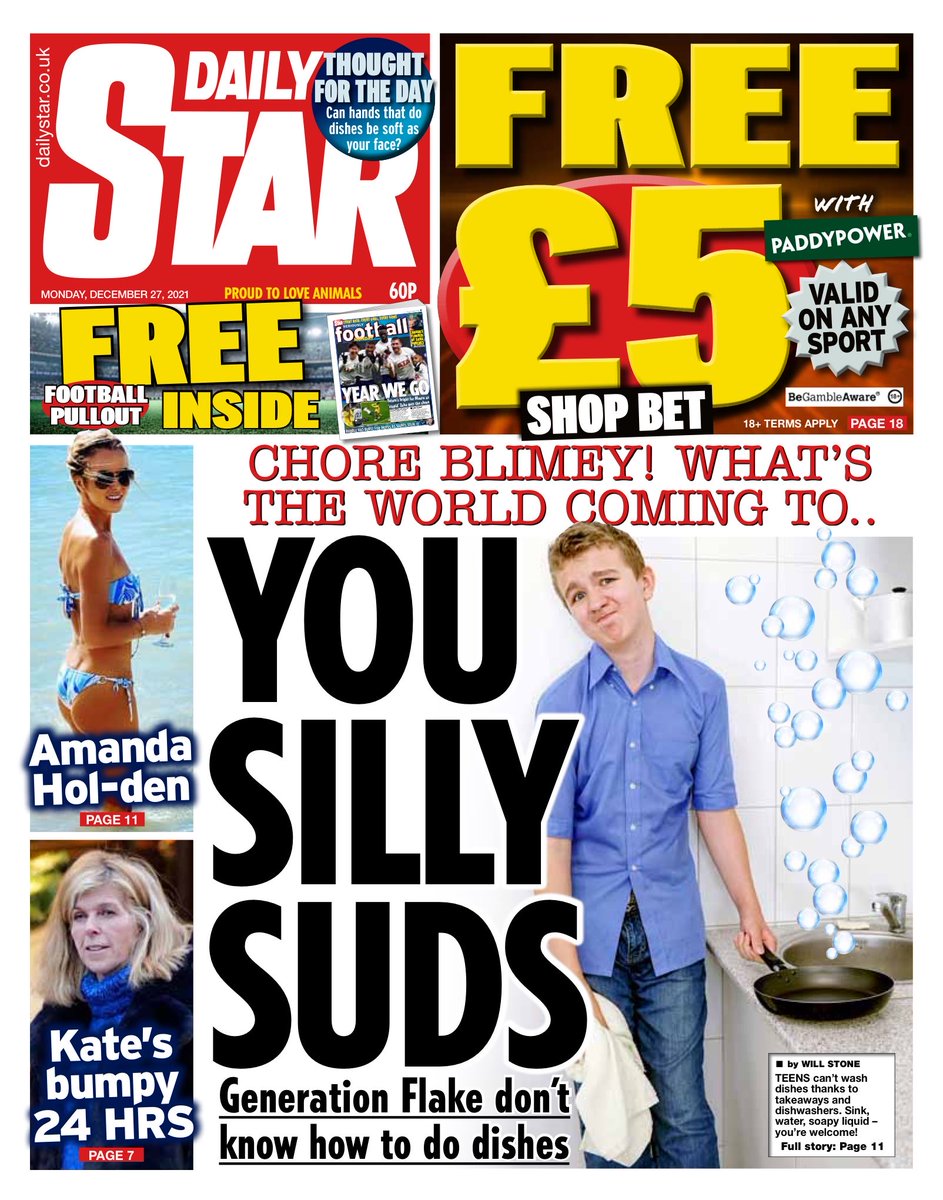 Teenagers do not know how to wash up, according to the Daily Star’s front page.