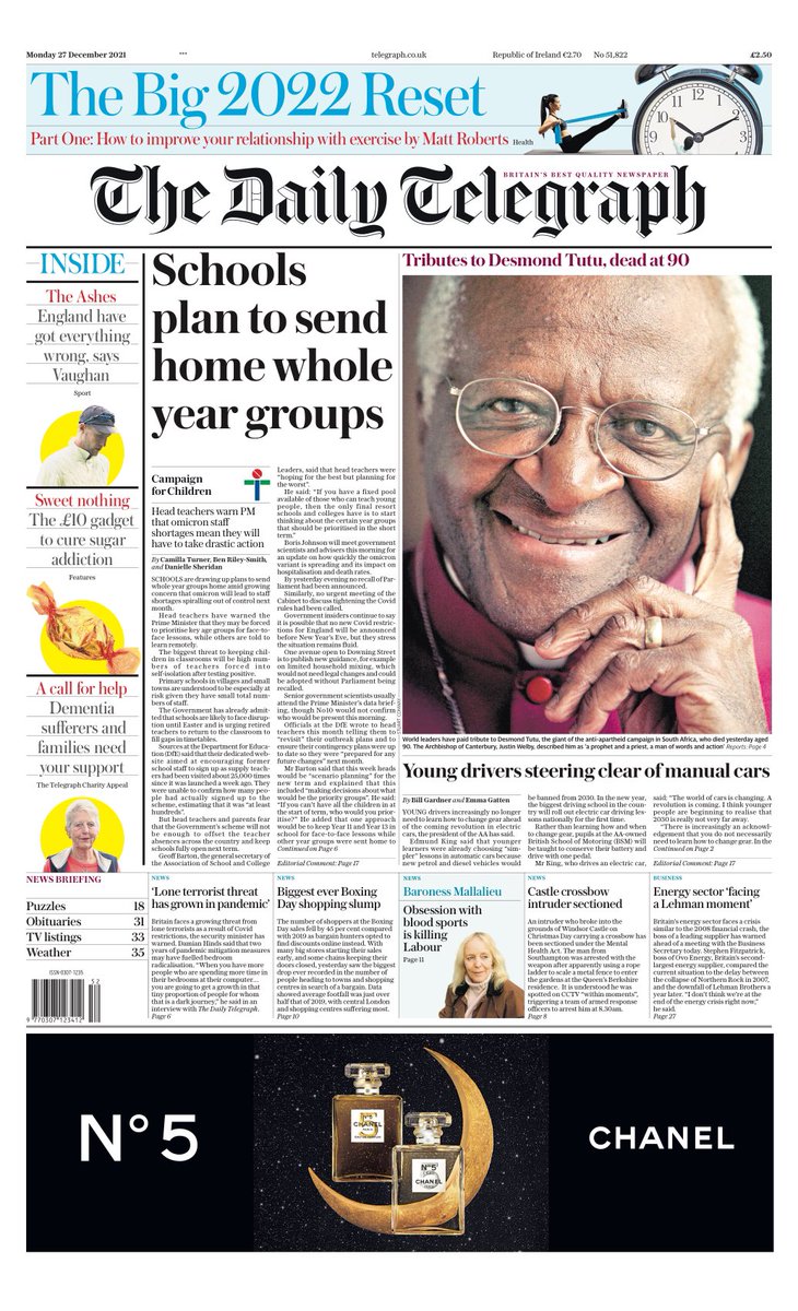 Schools are drawing up plans to send whole year groups home amid growing concern that Omicron will lead to staff shortages spiralling out of control next month, reports The Daily Telegraph.