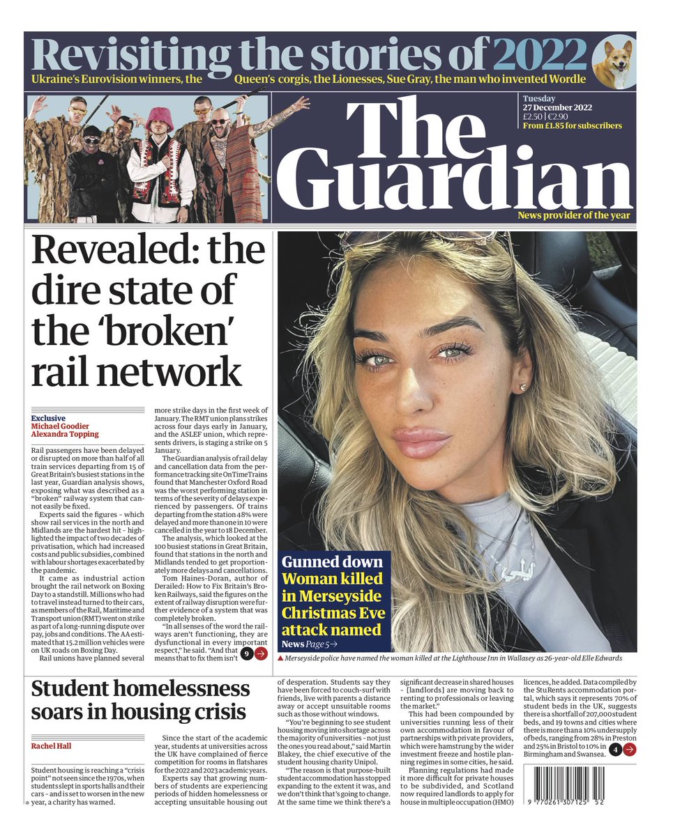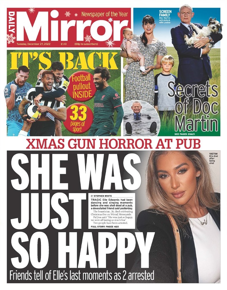 Elle Edwards, the young woman fatally shot at a pub in Merseyside, is featured in the Daily Mirror’s lead story.
