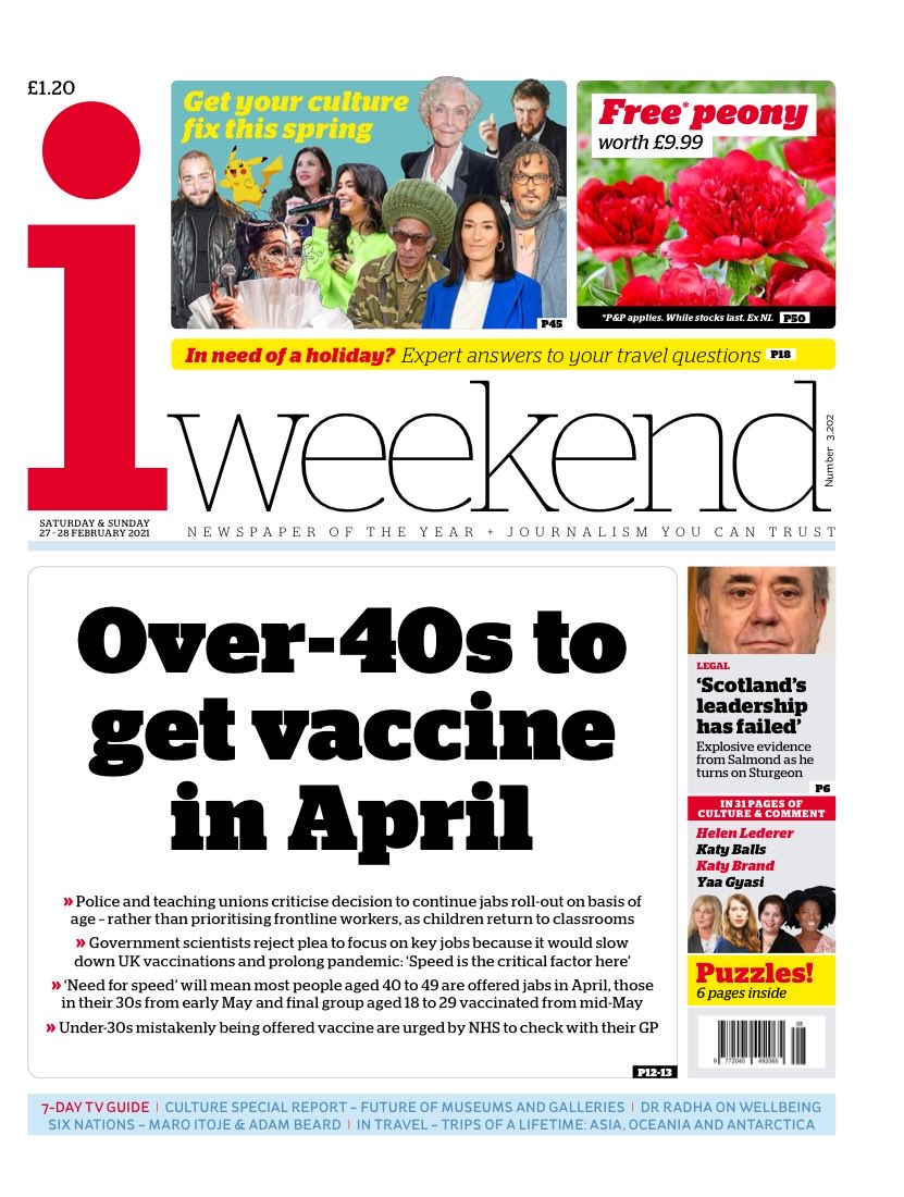 The i leads on the news the over-40s will receive their first COVID-19 jabs in April.The health secretary has defended the plan – read more here.