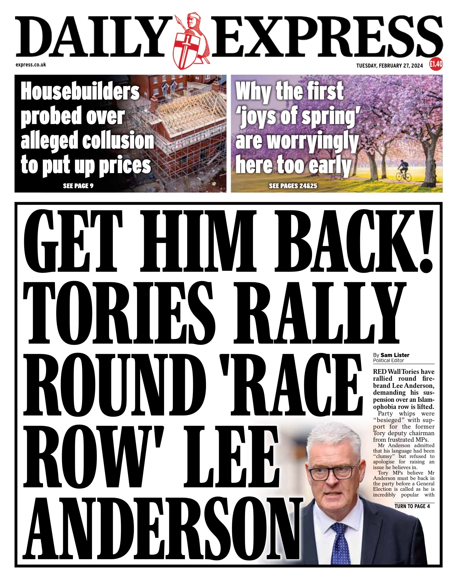 The Daily Express reports that Red Wall Conservatives are urging for the reinstatement of Lee Anderson into the Tory party.