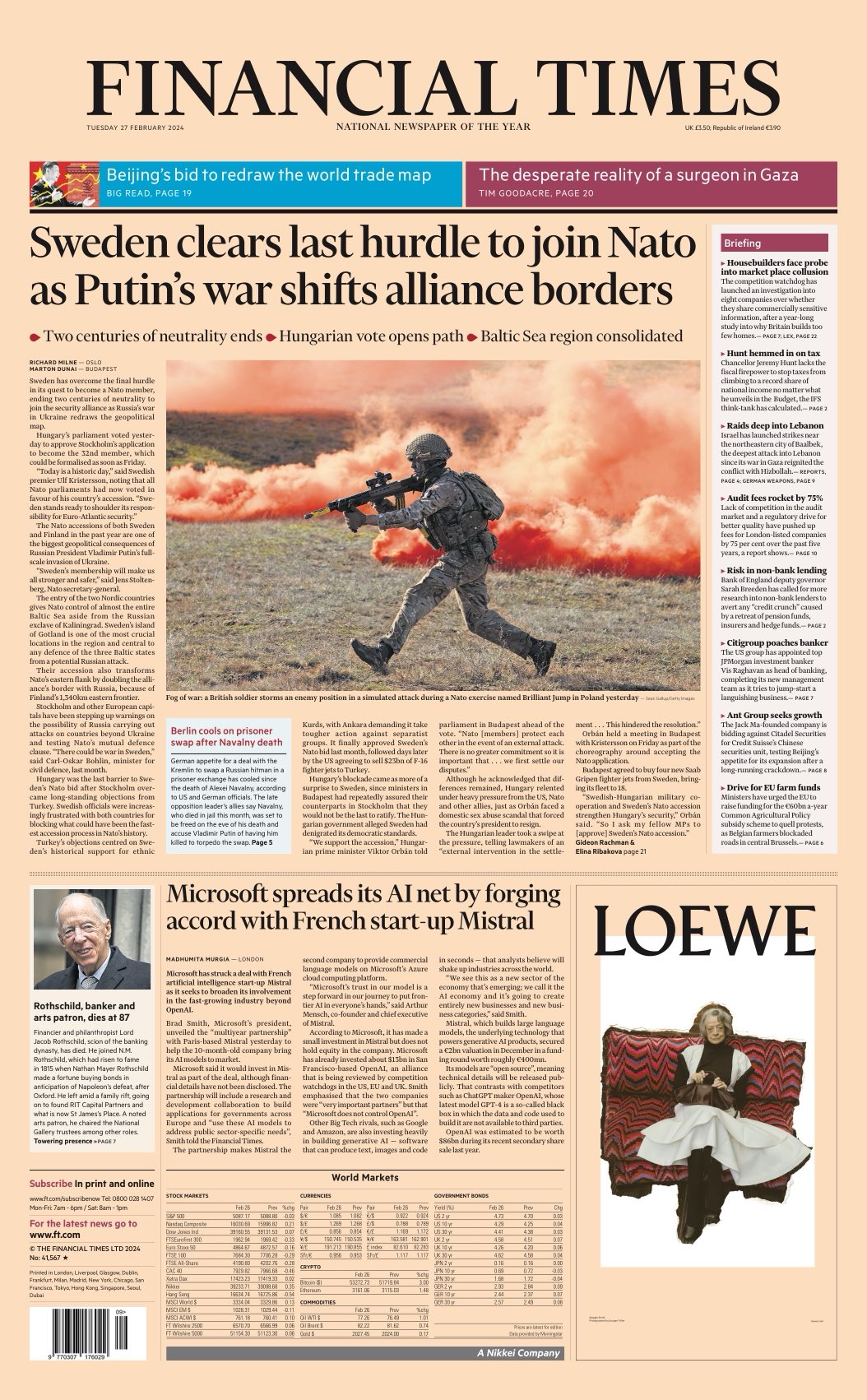 The Financial Times reports on Sweden’s successful NATO membership bid following Hungary’s approval.