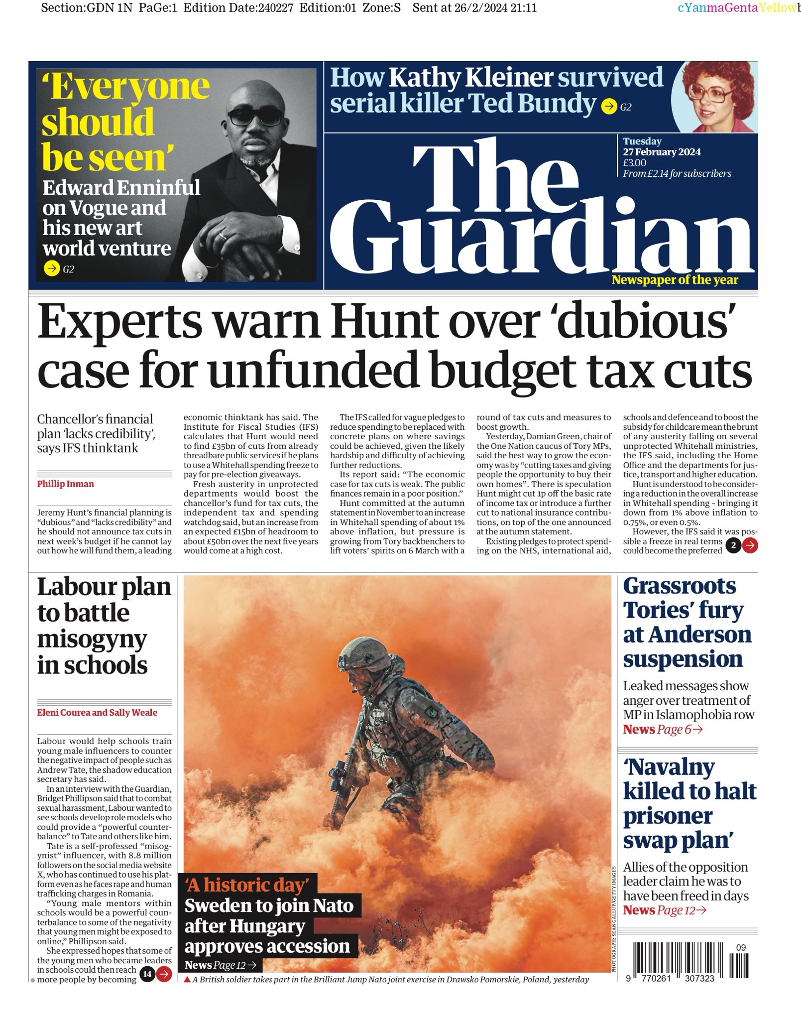 The Guardian reports on experts warning the chancellor about the risky proposition of unfunded tax cuts in the forthcoming budget.