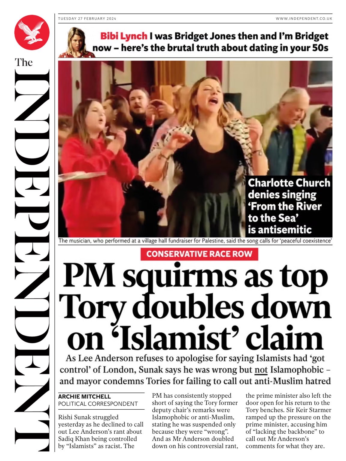 The Independent highlights the criticism faced by the prime minister for not condemning Lee Anderson’s alleged Islamophobic remarks about Sadiq Khan.