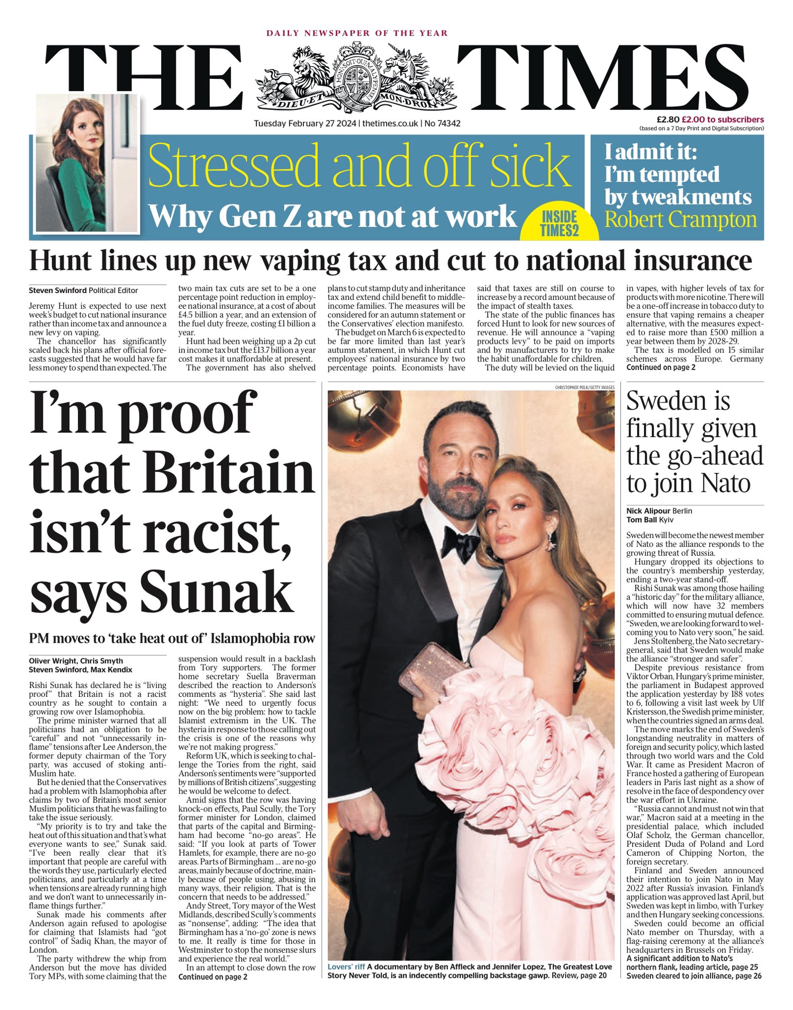 The Times reports on Rishi Sunak’s assertion that his success is evidence against Britain being a racist country amidst ongoing party Islamophobia claims.