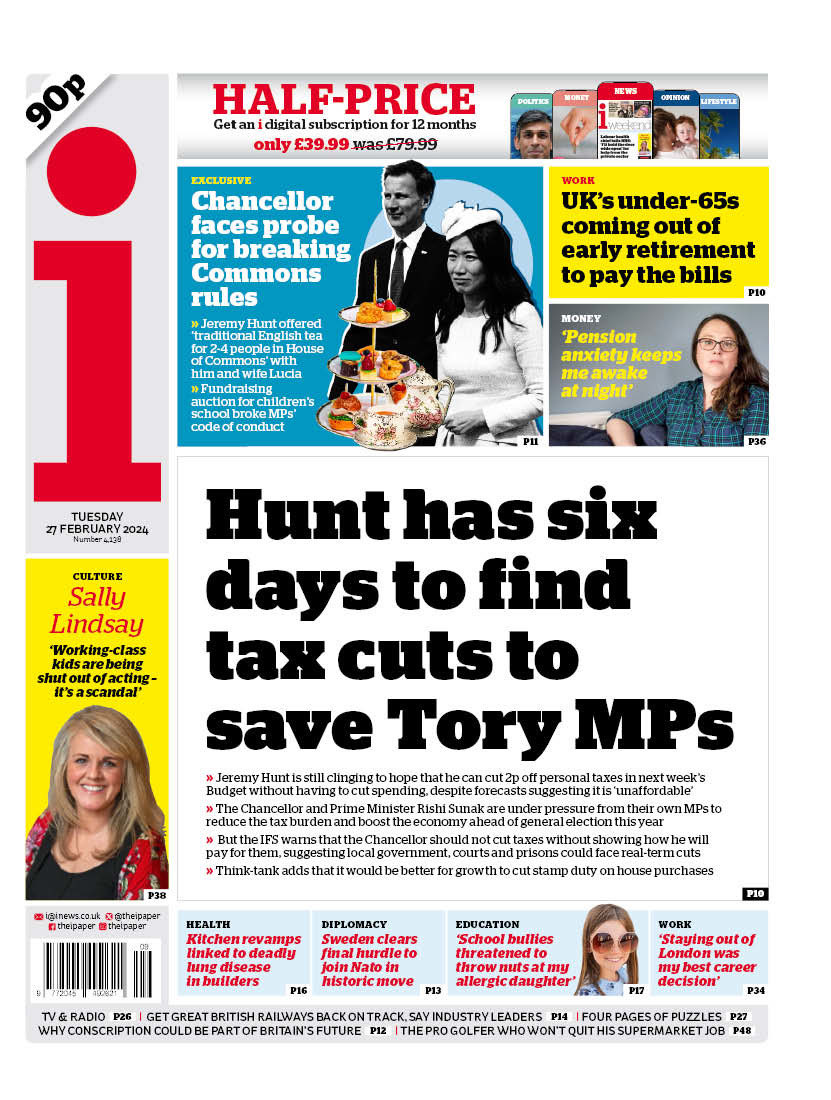 The i reports Jeremy Hunt’s race against time to find tax cuts to save Tory MPs from defeat.