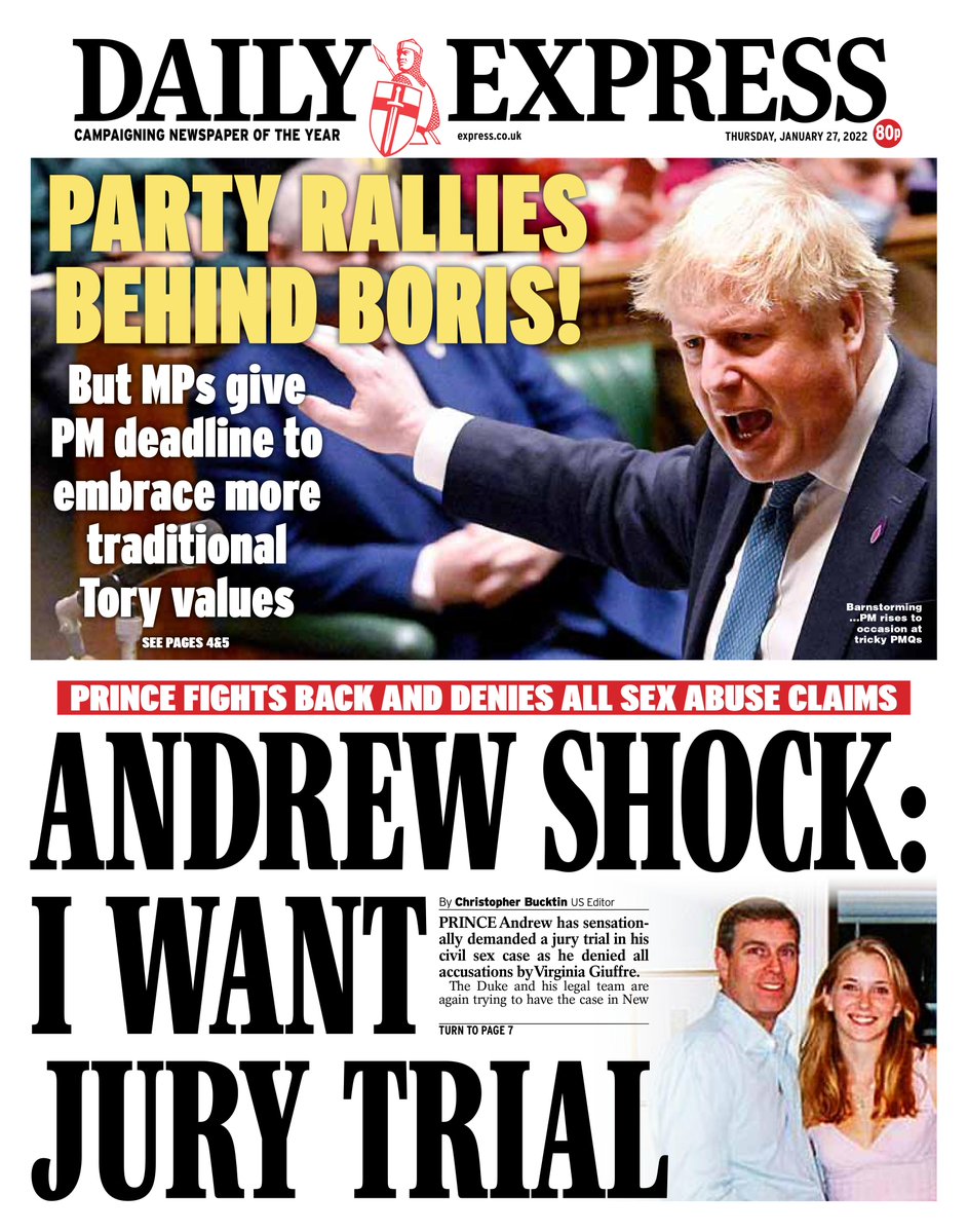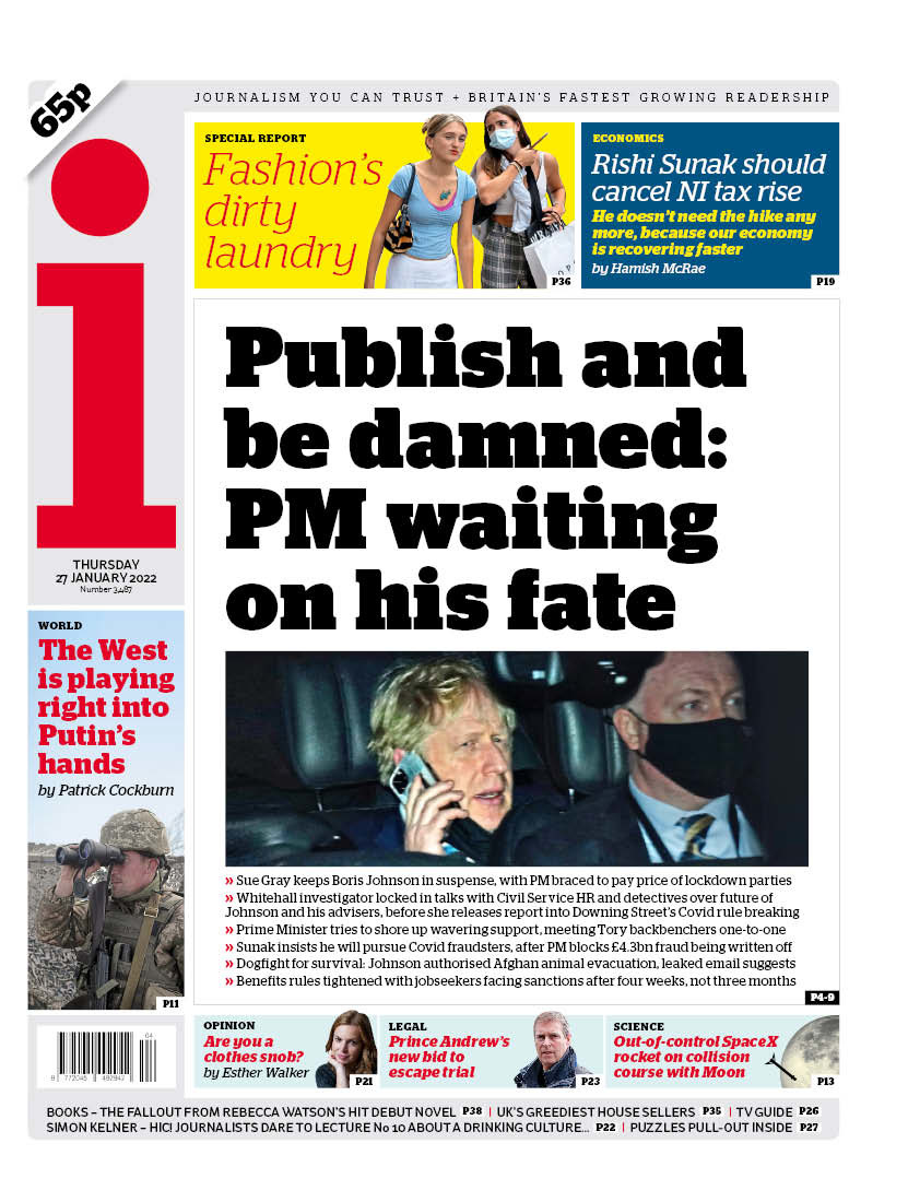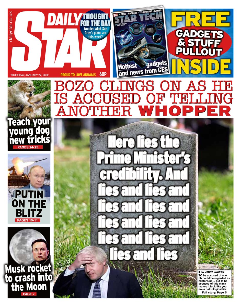 The Daily Star has a picture of a tombstone with the words ‘Here lies the prime minister’s credibility. And lies and lies and lies and lies…’ The paper says Boris Johnson is ‘clinging on’ as he is accused of telling ‘another whopper’.
